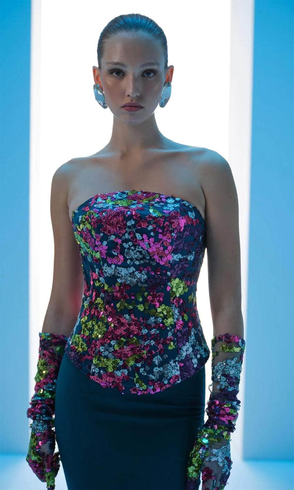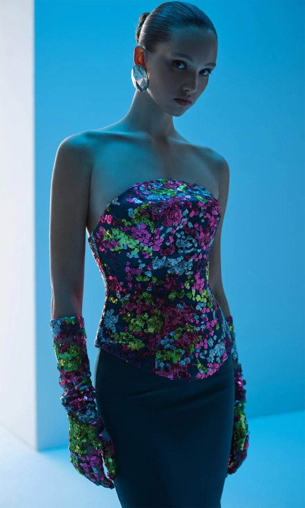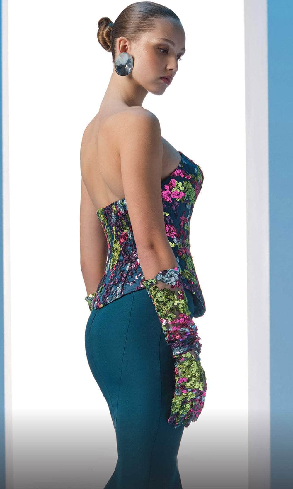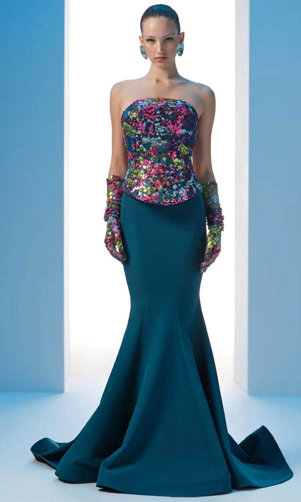 Stay at the forefront of fashion with this MNM Couture N0616 masterpiece. Adorned with sequins in a variety of hues, this gown will make you stand out and shimmer from every angle. The strapless bodice presents a straight-cross neckline and a mid-open back. A matching glove enhances your elegant appearance. With princess seams detail that flatters your curves naturally, the skirt creates a mermaid silhouette that hits the floor and sweeping denouement. This MNM Couture N0616 long ensemble is picture-perfect for your evening events. Model is wearing Petrol color.