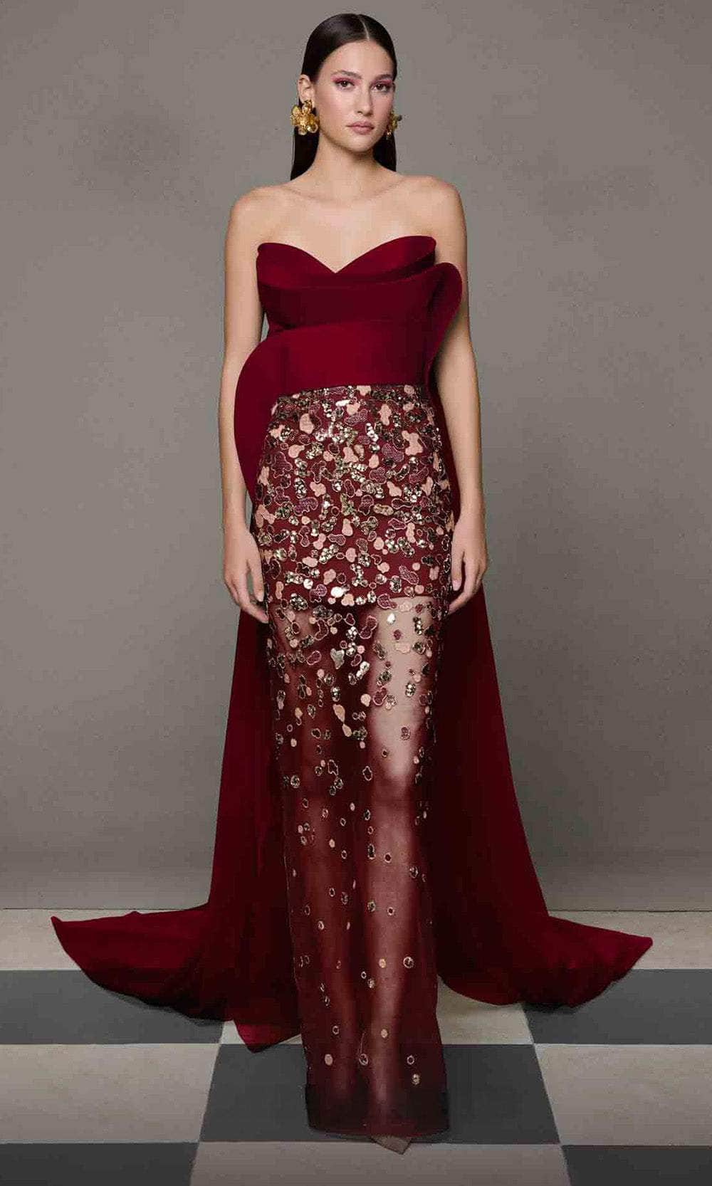 A romantic fusion of artistry and structure defines MNM Couture N0625. The strapless bodice boasts sculptural, wave-like folds that wrap the torso in an almost architectural design. This seamless structure is balanced by a sheer sheath skirt enhanced with sequin floral embroidery in pastel hues, giving it a whimsical yet couture flair. The back flows into a long Watteau sheer train, adding lightness to the column silhouette. MNM Couture N0625 is for those who want detail, texture, and originality in one unforgettable gown. Models are wearing Burgundy, and Mint colors.