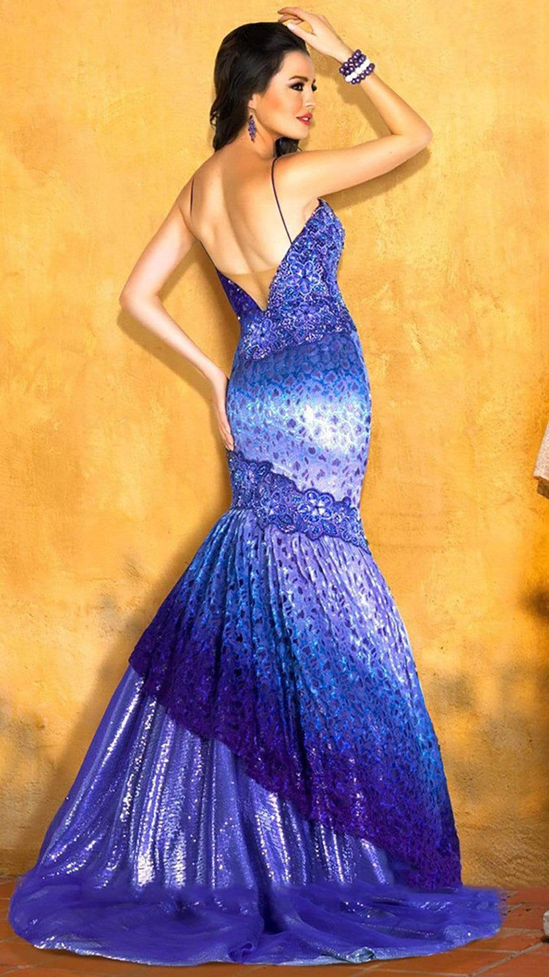 This sleeveless ensemble makes a statement in a v neckline and spaghetti straps. Stones and beads are embellished at the right side bodice and at knee length. The ombre effect throughout the dress makes this gown very visible. This long dress flows to a full length hem and ends to a mermaid silhouette. The open back has sheer inset.