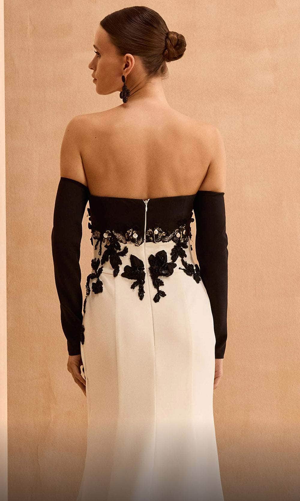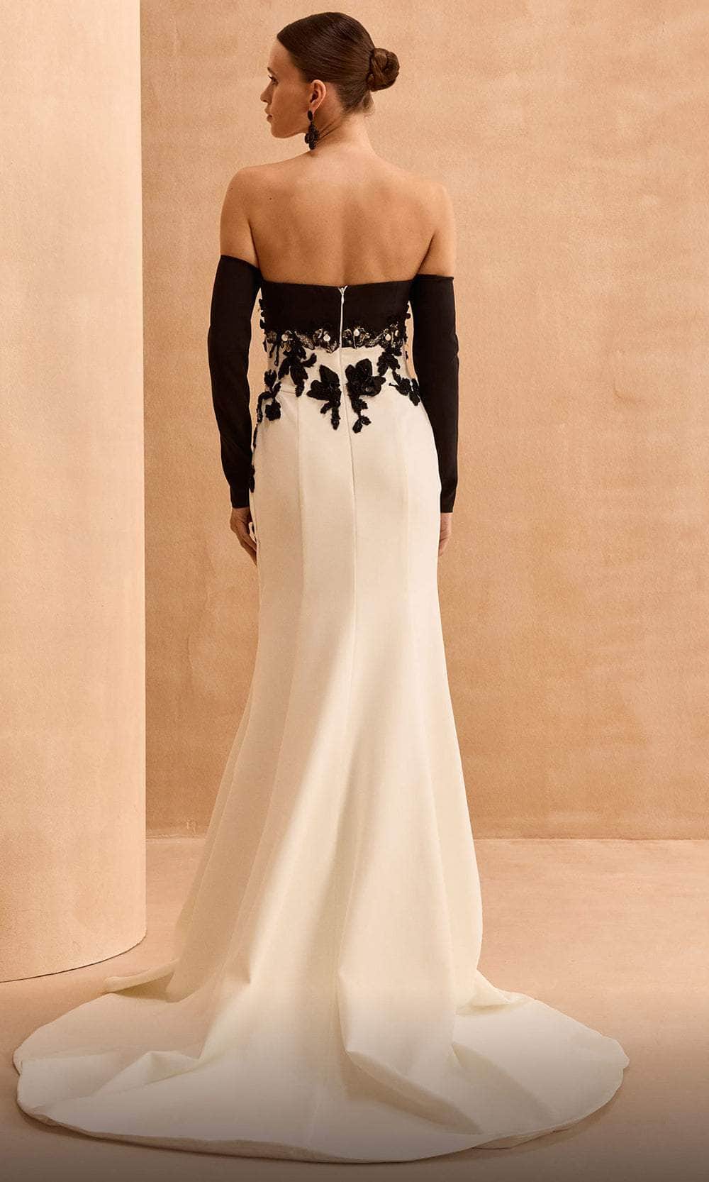 Captivate everyone with your feminine grace of this MNM Couture V02038 masterpiece. This two-tone creation presents an off-shoulder straight-across neckline and slim long sleeves with a zipper for a contemporary edge. The floral embroidery and intricate beading detail on the bodice will surely turn heads. Flaunt some skin with its mid-open design in the back. The skirt forms a beautiful sheath silhouette that smoothly cascades to the floor and extends into a dramatic sweeping train. Own the night in this MNM Couture V02038 gown, exuding elegance and sophistication. Model is wearing Black/White color.