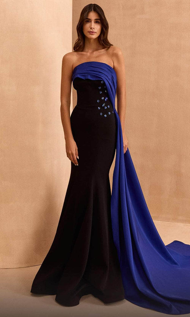 A timeless masterpiece, this MNM Couture V07378 evening gown exudes elegance and sophistication. A two-toned fabric, adorned with faceted beadwork crusting, creates a striking visual effect. The strapless design, accentuated by pleated sash details that trail into a graceful train, adds a touch of sophistication. The mermaid skirt, culminating in a dramatic silhouette, completes this stunning ensemble. The MNM Couture V07378 is a timeless evening gown that is a testament to enduring style, perfect for the woman who desires to make a lasting impression. Models are wearing the Black/Royal color.