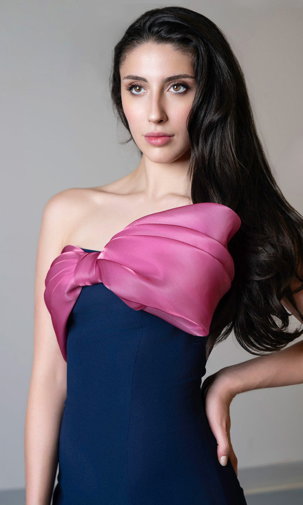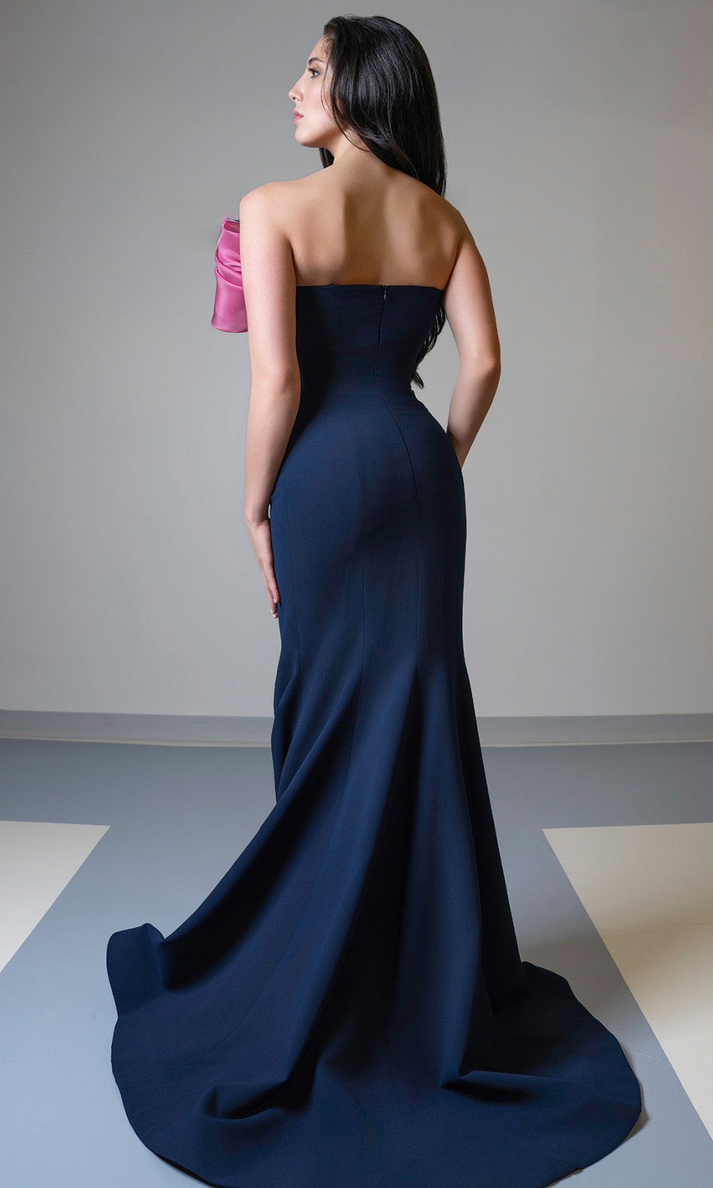 Make a sophisticated statement with the MNM Couture V07514, a design that exudes contemporary elegance. Featuring a strapless cut, sweetheart neckline and a dramatic organza bow, this gown offers a fresh and artistic take on classic eveningwear. The mermaid silhouette hugs the body beautifully, adding graceful movement to every step. Perfect for formal galas or upscale weddings, the MNM Couture V07514 promises to leave a lasting impression wherever your evening unfolds. Model is wearing Navy/Pink color.