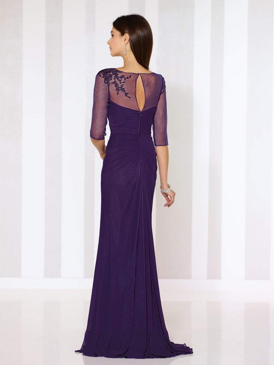 Stretch mesh and tulle sheath with illusion three-quarter length sleeves, illusion bateau neckline, gathered bodice with hand-beaded lace appliques, beaded illusion keyhole back, side draped skirt with center back gathers and sweep train. Model is wearing Purple and Navy colors.