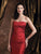 Two-piece silk dupioni formal dress set, strapless sheath with side draped bodice, center back slit, matching bolero jacket with three-quarter length sleeves accented with crystal buttons at cuffs. Removable straps included.
