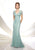 Lace and tulle slim trumpet gown with lace illusion short sleeves, front and back scalloped V-necklines, dropped waist, inset sweep train.Model is wearing the Green color dress