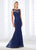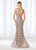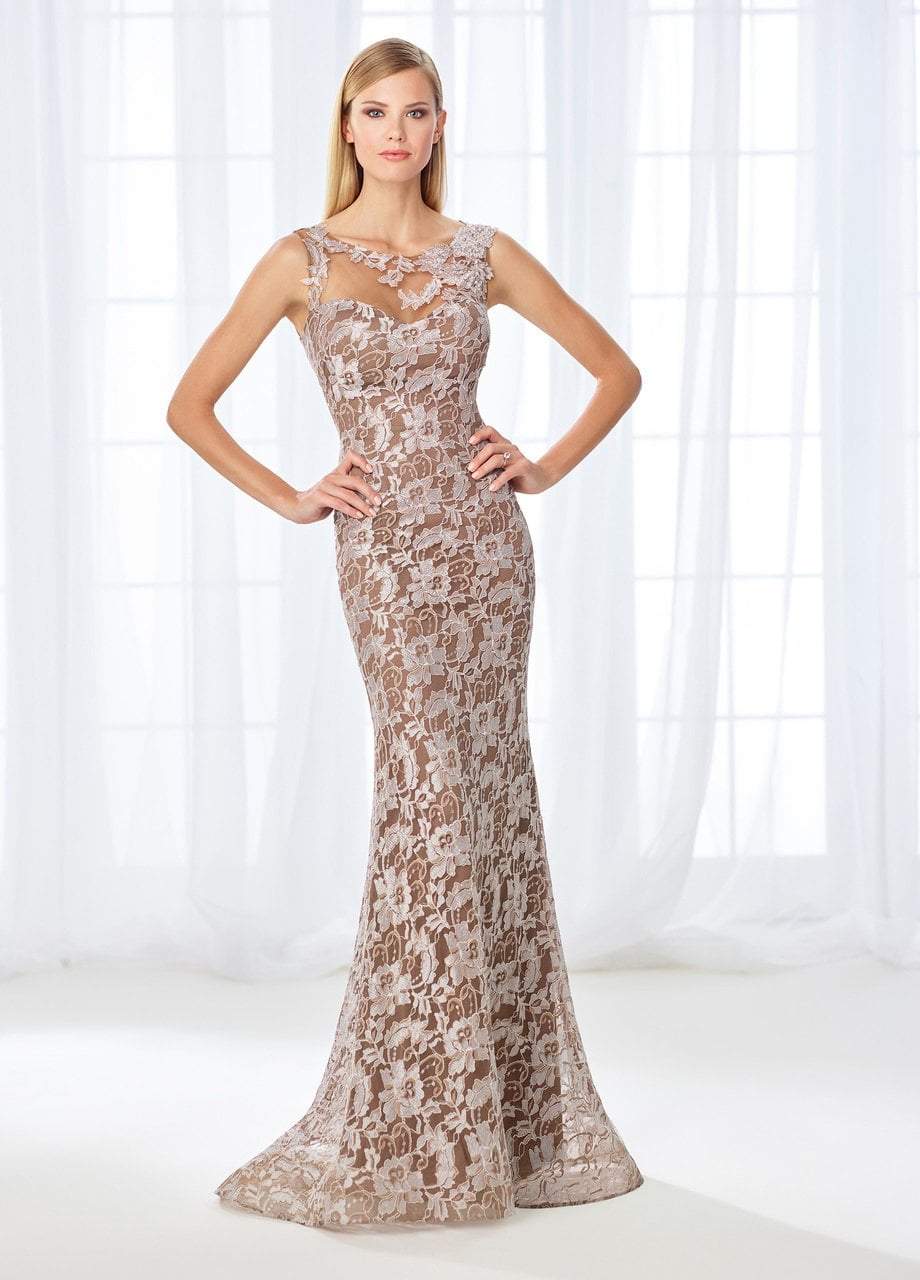 This sleeveless ensemble shows an allover beaded lace fit and flare gown. Accented with an illusion bateau neckline and dome-cutout back, detachable long lace sleeves charms the bodice. This slim-flared dress is designed in lace over a solid lining, and finishes in a sweep train.