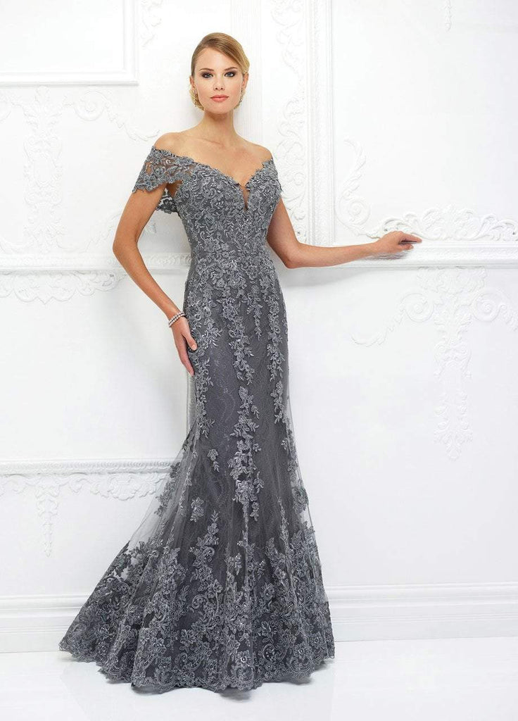 Charms in a plunging off-shoulder neckline with sheer inset at mid-bust. The fitted bodice has sheer short sleeves and ornate with lace appliques allover the dress. The tulle skirt has a trumpet silhouette and finishes the look in a sweep train. The dress includes a matching shawl. Model is wearing Pewter color.