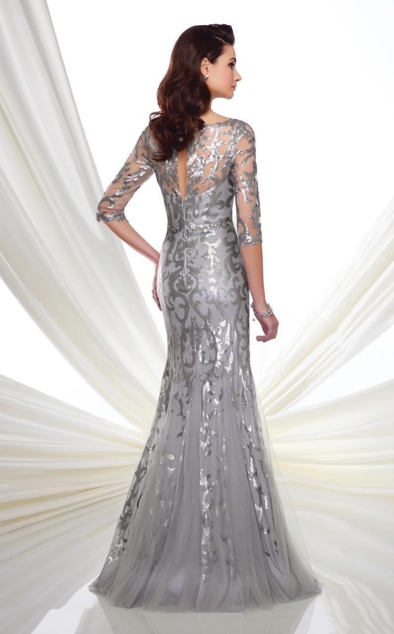 Sequin trumpet dress with illusion three-quarter sleeves, V-neckline, hand-beaded natural waistline, keyhole back, sweep train.
