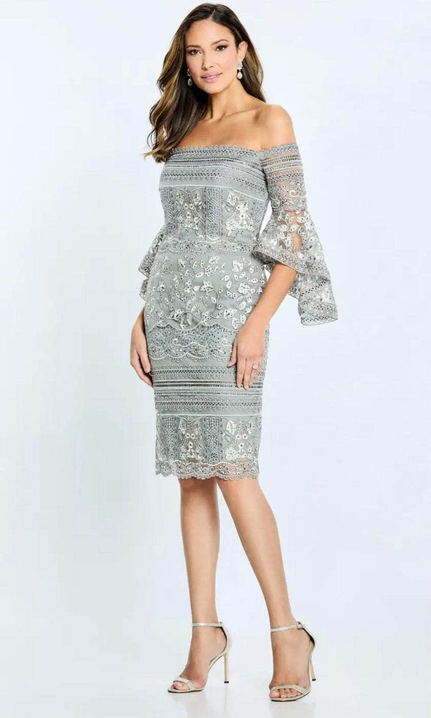 Make a captivating entrance with the Montage by Mon Cheri 218801 cocktail dress. This exquisite creation is a masterpiece of intricate allover embroidered lace, embellished with delicate rhinestones that shimmer with every step. The off-the-shoulder neckline while the dramatic bell sleeves exude a touch of vintage inspiration. The dress cinches at the midrise back with a concealed zipper closure, ensuring a flawless fit. The sheath skirt skims the figure, culminating in a universally flattering knee-length hem. This Mon Cheri 218801 cocktail dress turn heads with its enchanting allure. Model is wearing the Gray Multi color.