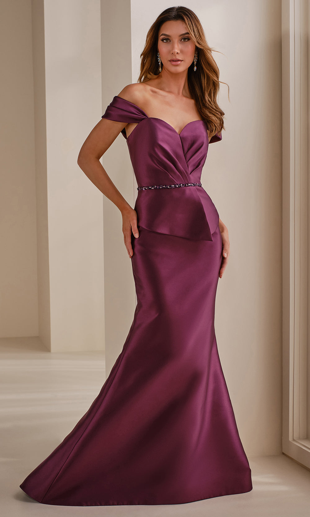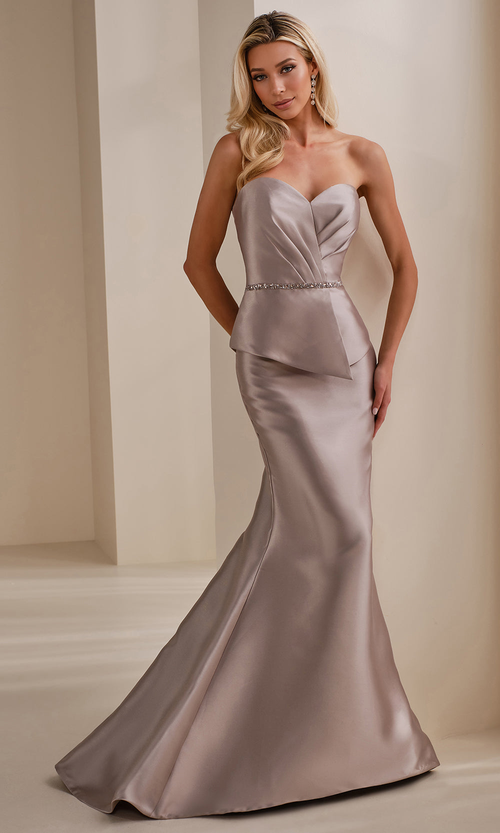 A poised design meets a sculpted silhouette in Montage by Mon Cheri M3106MKD. This floor-length Mikado gown features detachable tapered shoulder straps that frame the neckline with soft structure. A structured peplum and artful pleating shape the bodice, adding graceful dimension before meeting a beaded belt that accents the natural waist. The mermaid skirt elegantly shapes the form before extending into a graceful sweep train. Montage by Mon Cheri M3106MKD is a flawless choice for those who appreciate form-fitting style with classic elements. Models are wearing Dusk, Taupe, and Aubergine colors.