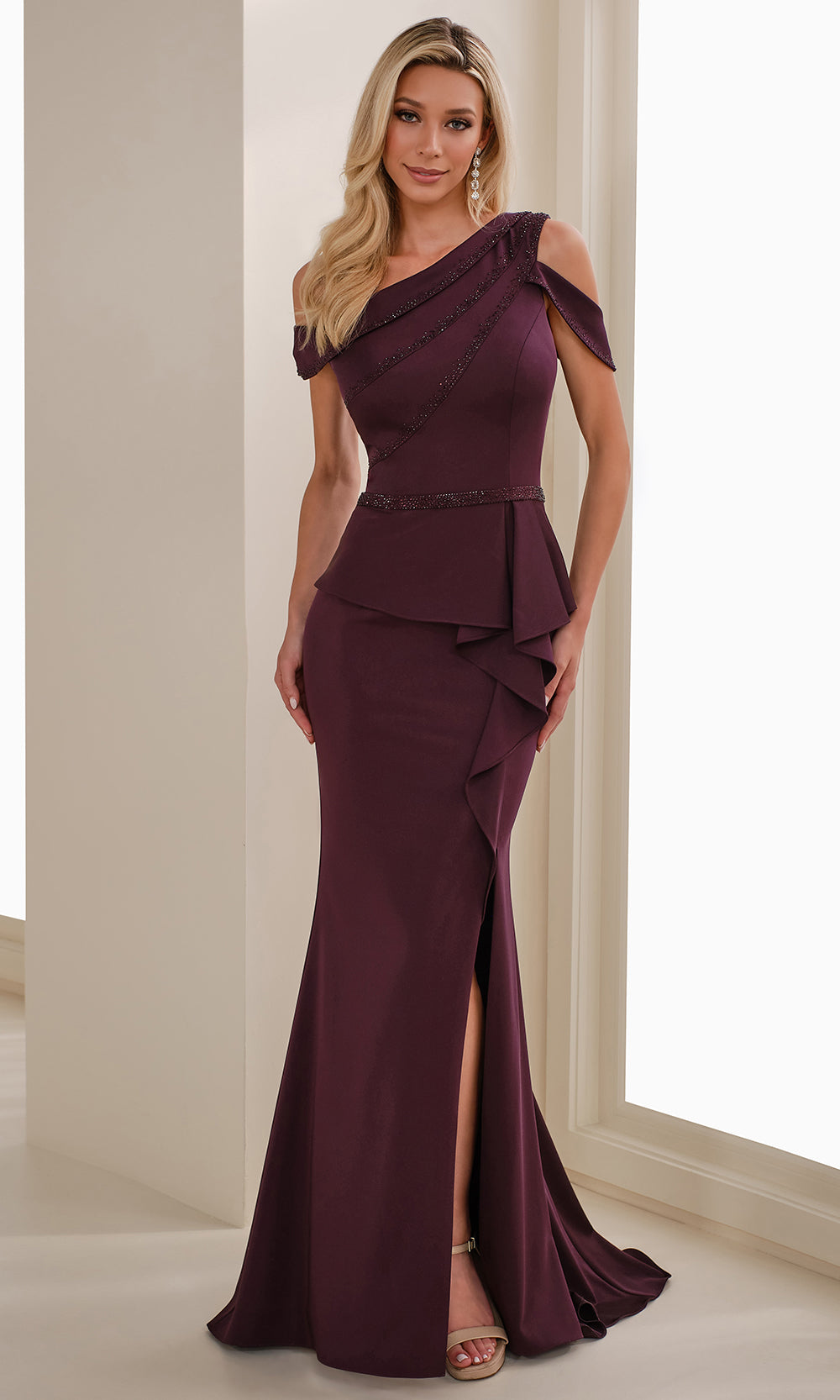An exquisite silhouette makes this Montage by Mon Cheri M3107 a standout choice. This full-length gown features a modern asymmetric neckline adorned with beading for a graceful touch. The fitted crepe bodice is enhanced by a soft peplum detail that cascades into a delicate ruffle, bringing a sense of movement to the sleek silhouette. The natural waistline is accented with a beaded thin waistband, creating definition while the sheath skirt finishes with a tasteful thigh-high slit. Montage by Mon Cheri M3107 is an ideal look for anyone seeking a combination of polished elegance and understated glamour. Models are wearing Smoke, Tea Rose, Eggplant, and Oyster colors.