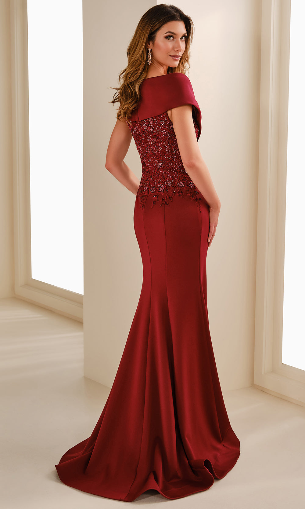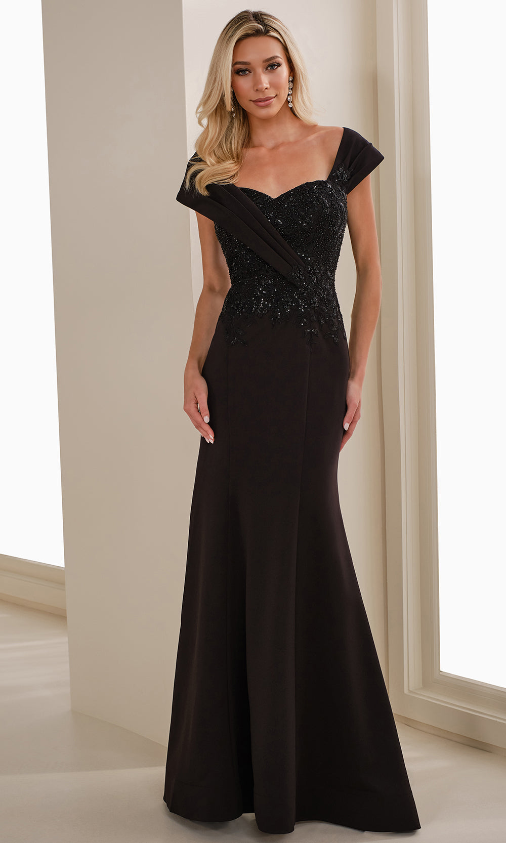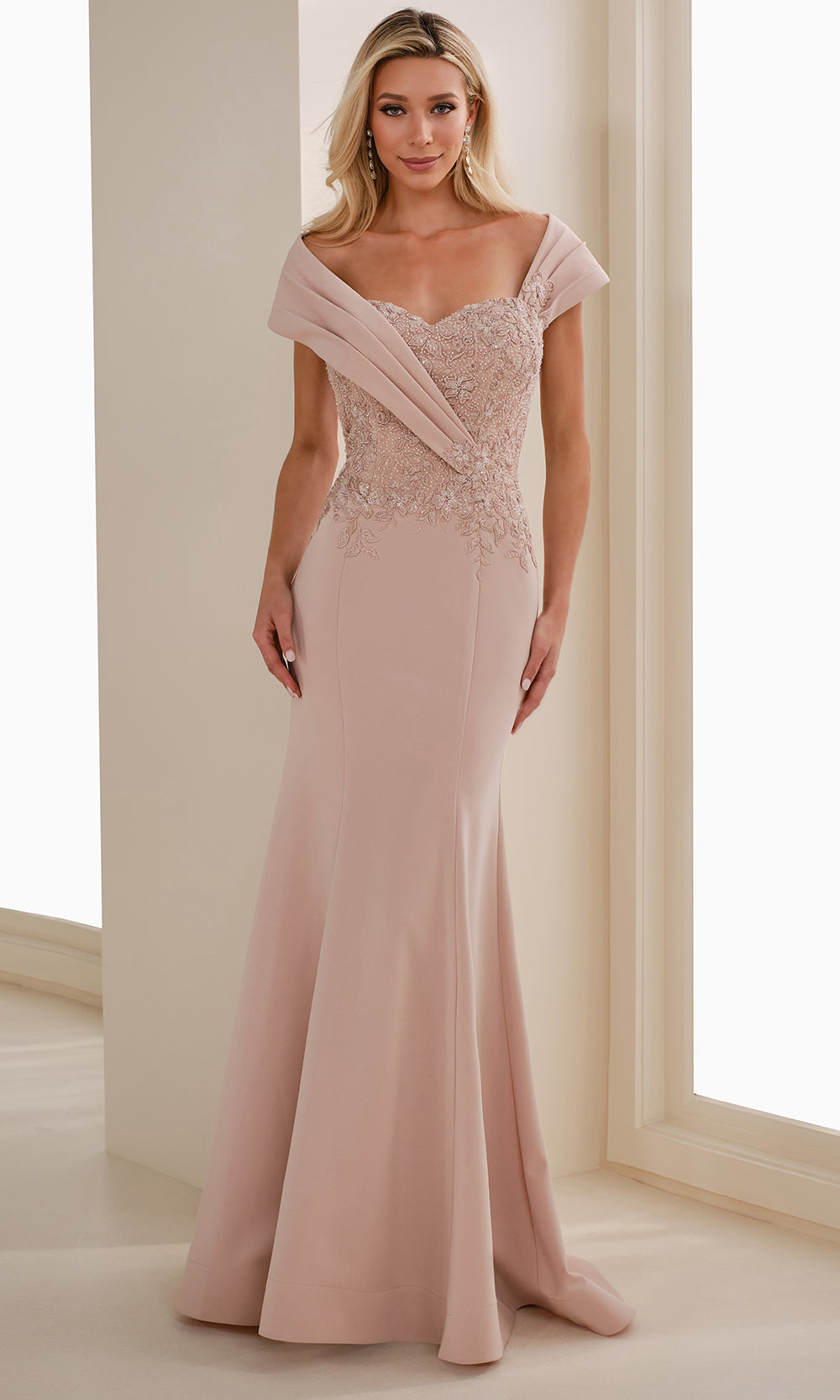 Let your elegance take center stage with the Montage by Mon Cheri M3108 gown. A draped off shoulder sleeves and sweetheart neckline draws the eye, while the fitted bodice is adorned with embroidered lace, sequin and beading that shimmer with subtle brilliance. The mermaid silhouette enhances the figure and leads into a floor length skirt that delivers dramatic flair. Designed in crepe, the Montage by Mon Cheri M3108 is a perfect balance of structure, style, and fluid movement. Models are wearing Bordeaux, Black, Navy, and Blush colors.