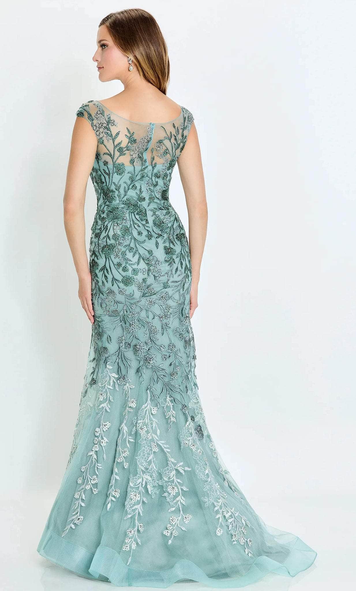 Turn heads with the stunning elegance of the Montage by Mon Cheri M522 evening gown. This exquisite piece is adorned with intricate lace embroidery and dazzling beadwork, creating a breathtaking foliage-inspired pattern. The plunging V-neckline with a sheer panel adds allure, while delicate cap sleeves enhance its refined appeal. The mermaid silhouette elegantly flows into a sweeping train with a structured horsehair hem, ensuring a graceful finish. A matching shawl completes this timeless look.