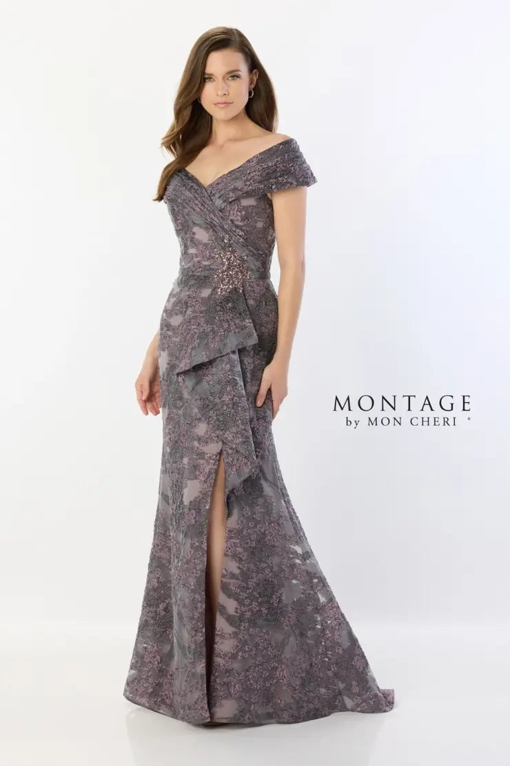 Charm everyone with the fascinating beauty in this Montage by Mon Cheri M523 creation. Elegant and whimsical, this gown is adorned with floral appliques over a novelty organza fabric, featuring an off-the-shoulder bodice and a sweetheart neckline. From the embellished natural waist, the skirt reveals a sheath silhouette with a wrap style displaying a high slit as it flows to the floor in a sweeping train. This dress includes a shawl that match perfectly. Dance the night away in this tantalizing Montage by Mon Cheri M524 masterpiece.
