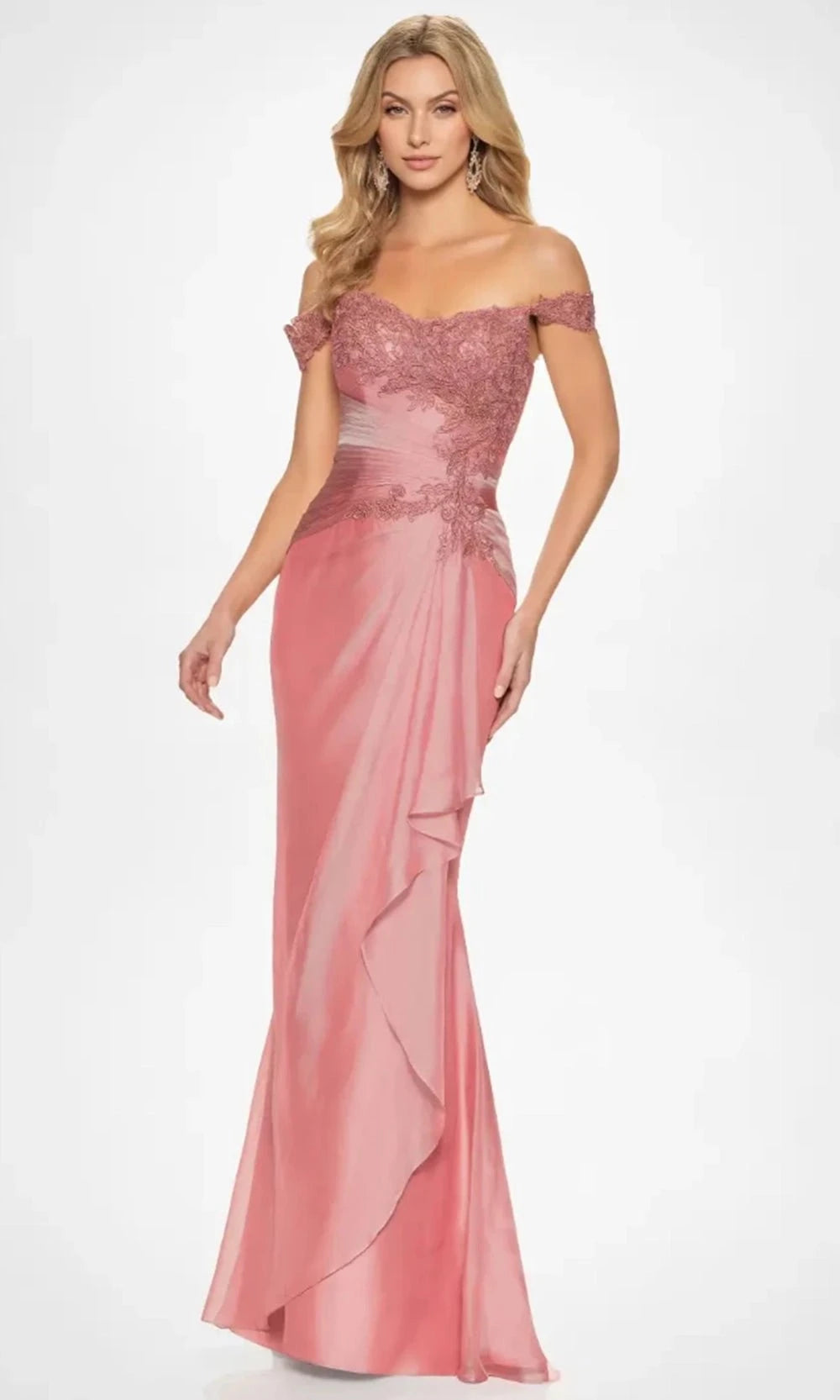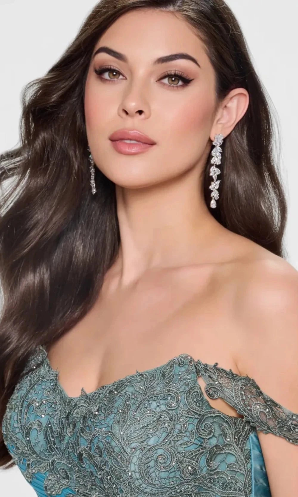 Make a striking statement in the Montage by Mon Cheri M843, a strapless gown with enchanting lace embroidery and beaded accents. The sweetheart neckline adds an alluring touch, while the draped sheath skirt cascades beautifully to the floor. For added versatility, this gown includes detachable off-the-shoulder straps, separate spaghetti straps, and a matching shawl. Whether you prefer a bold strapless look or a more elegant off-the-shoulder style, this Montage by Mon Cheri M843 gown adapts to your preference. Models are wearing Aqua, Lavender/Haze, and Gardenia colors.