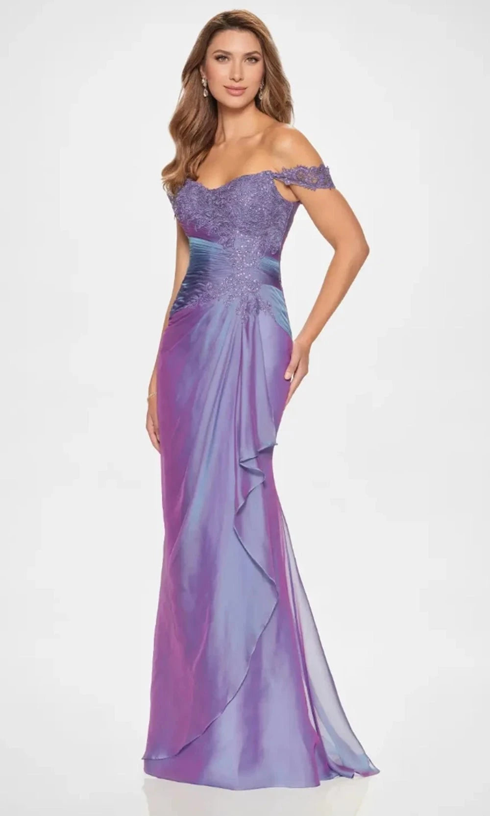 | Fabric: | Iridescent Chiffon, Lace Applique, Stone Accents & Pongee Lining |