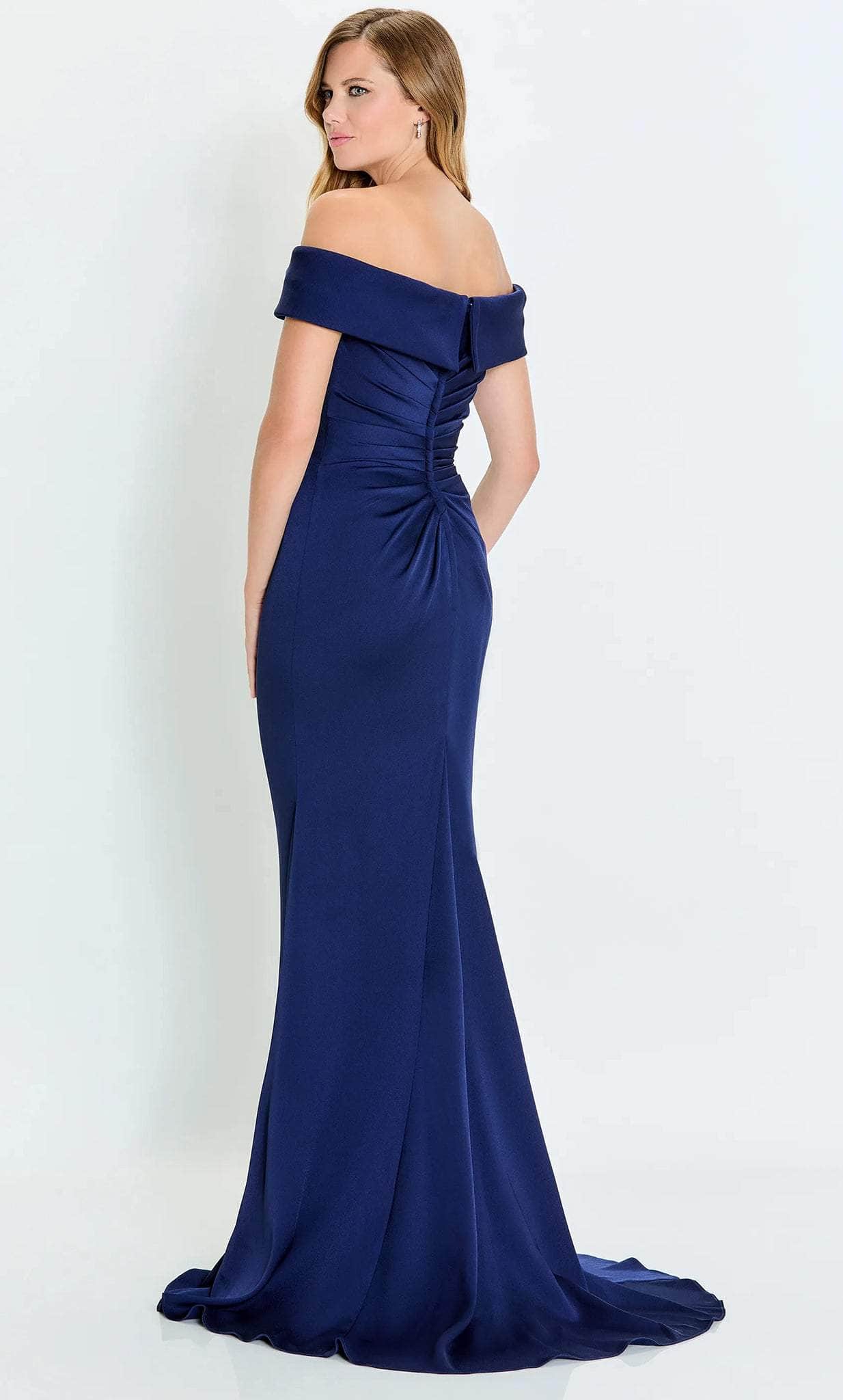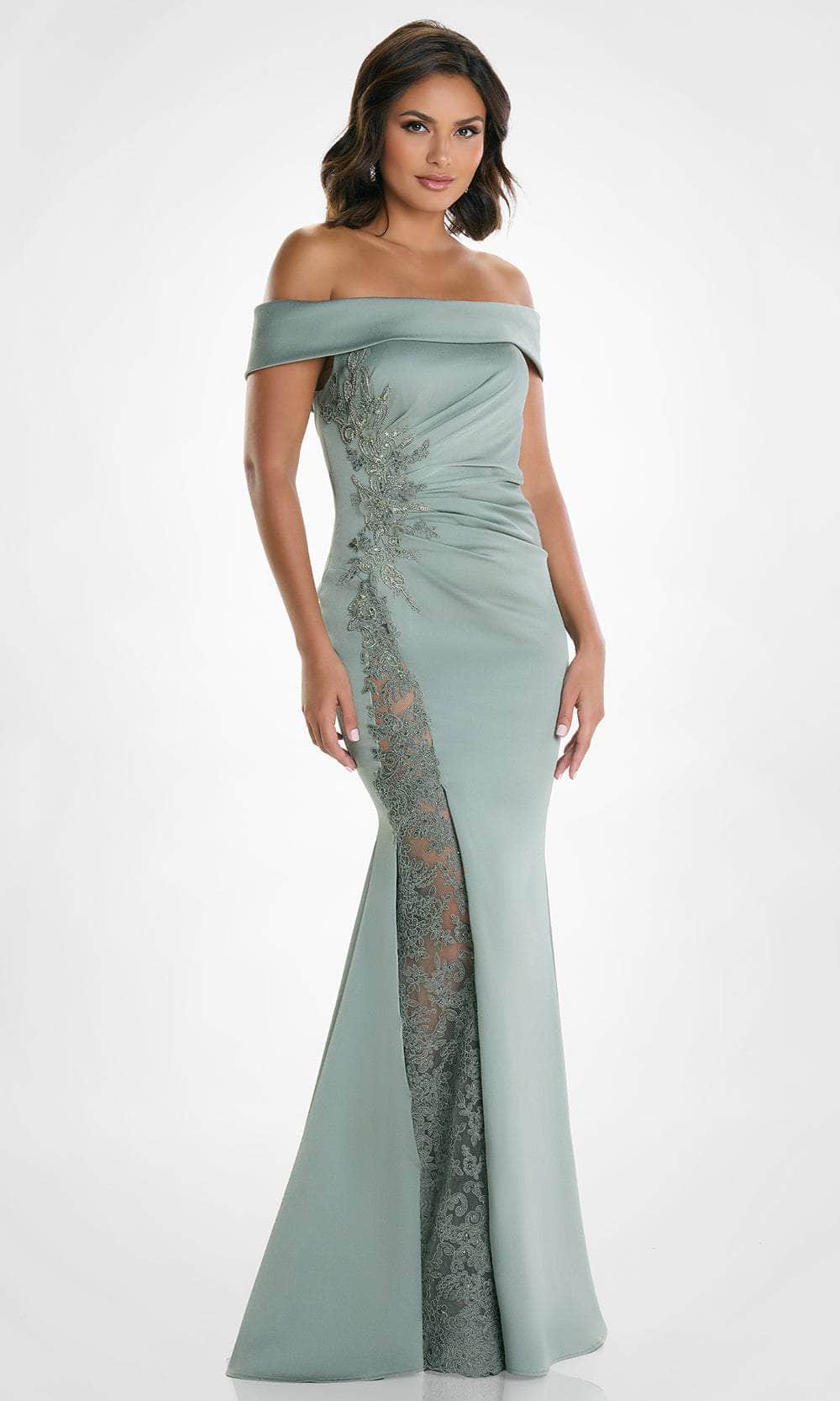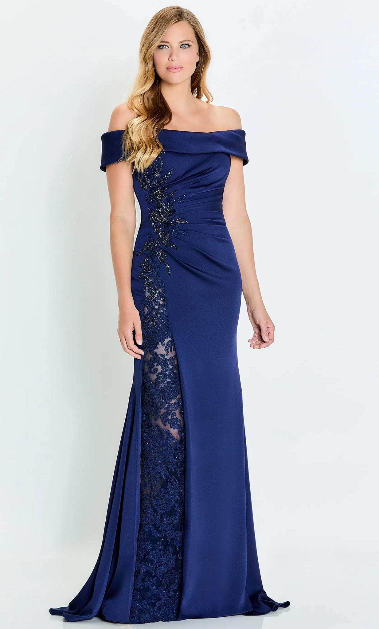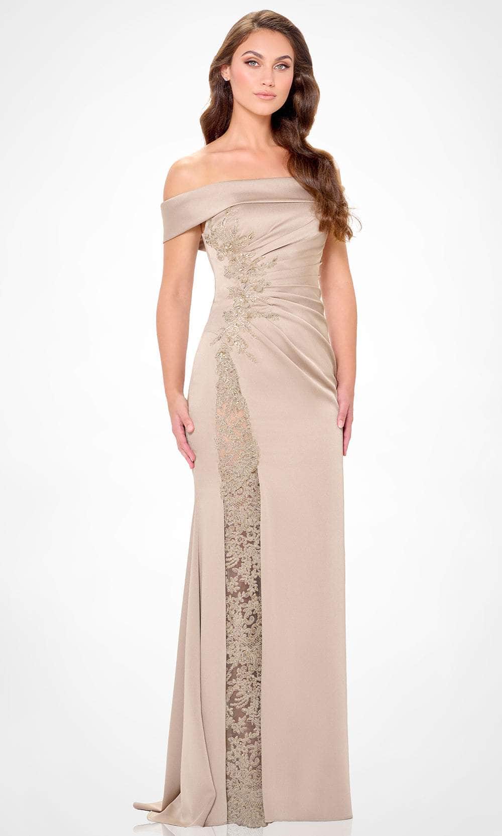 Turn heads in the Montage by Mon Cheri M535 gown, a design that exudes poise and refinement. Fashioned from stretch crepe, this dress features an off-shoulder neckline with fold-over detailing, striking a balance between classic and modern style. Ruching at the side enhances the figure, while delicate embellishments add a subtle shimmer. The sheath skirt falls gracefully into a sweeping train, complete with a high slit for added allure. With a detachable lace inset and shawl, this gown offers versatile elegance.