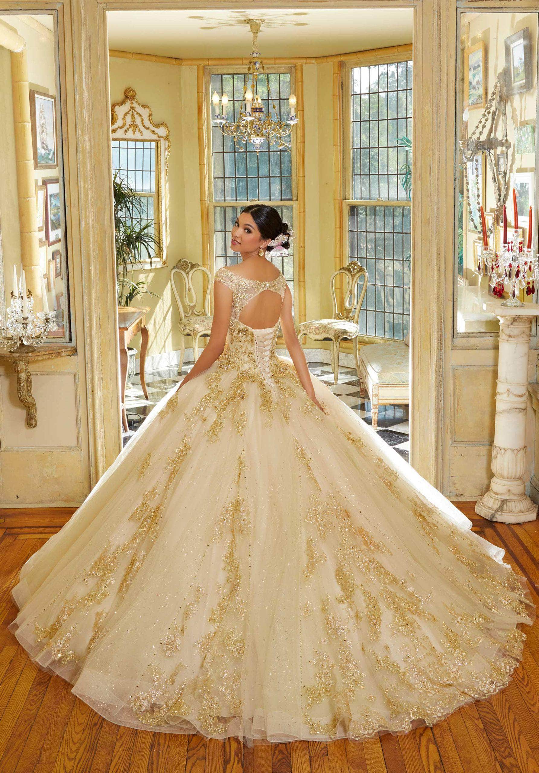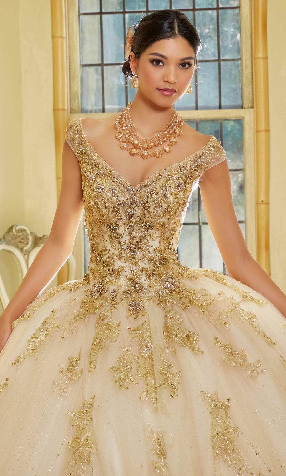 Mesmerize everyone when you cross the ballroom as you wear this Mori Lee 34064 creation. This shimmering Quinceañera dress has a V-neck, off-the-shoulder bodice designed with metallic embroidered appliques and complemented with keyhole back featuring dazzling jewel beading. Lace-up closure at the back ensures a snug fit. The basque waist gives way to the tulle over metallic glitter net ball gown dress that falls to a full length hemline and a sweep train finish. Look your absolute best in this majestic Mori Lee 34064 masterpiece. Model is wearing Emerald/Gold, Champagne colors
