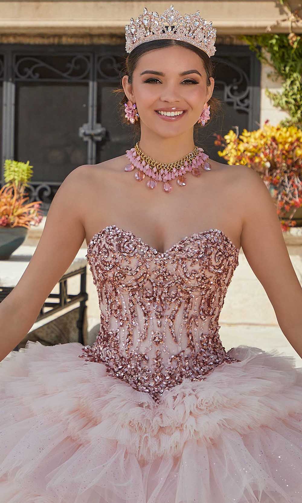 Mori Lee 34093 is a mesmerizing frilled ball gown that redefines opulence. The bodice boasts a symphony of patterned sequins, intricately adorned with sparkling crystal beading that ignites like constellations in the night sky. A tiered, pleated tulle and glimmering glitter tulle skirt cascade with every step, creating an enchanting dance of light and movement. Detachable frilled off-shoulder sleeves lend an air of romantic whimsy, while the sweetheart neckline and lace-up back add a touch of classic charm. This Mori Lee 34093 is a masterpiece that encapsulates grace and glamour in every detail. Models are wearing Blush/Rose Gold and Scarlet colors.