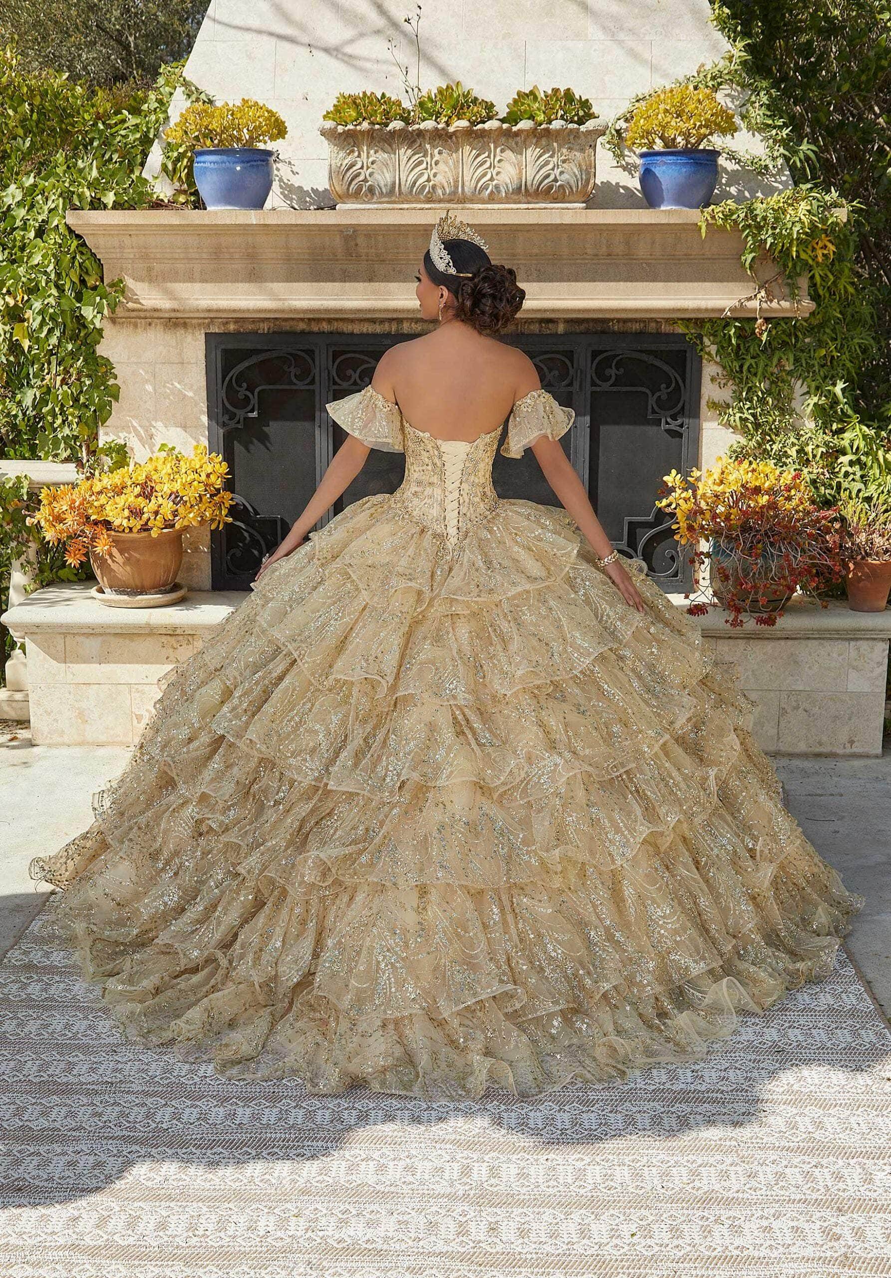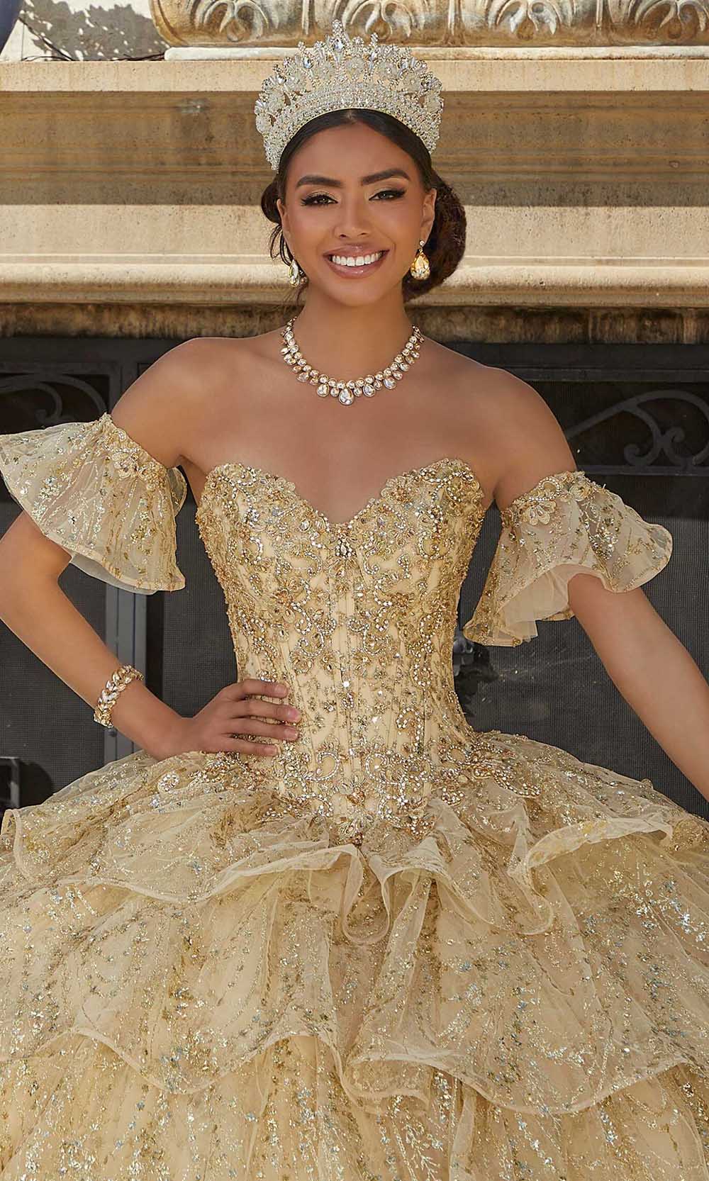 Step into a world of enchantment with Mori Lee 34094, a ball gown that embodies regal charm and modern allure. The corset bodice is a masterpiece, its sweetheart neckline adorned with swirling jeweled beading and intricate embroidery, evoking the essence of a fairytale. The fabulously tiered skirt, resplendent in pattern sequin and glitter tulle, captures the light with every move, while horsehair edging adds a touch of whimsy. The detachable off-the-shoulder sleeves mirror the gown's elegance, and the lace-up tie at the back ensures a flawless fit. This Mori Lee 34094 masterpiece allows you to dance through the night in ethereal grace. Models are wearing Scarlet and Gold colors.