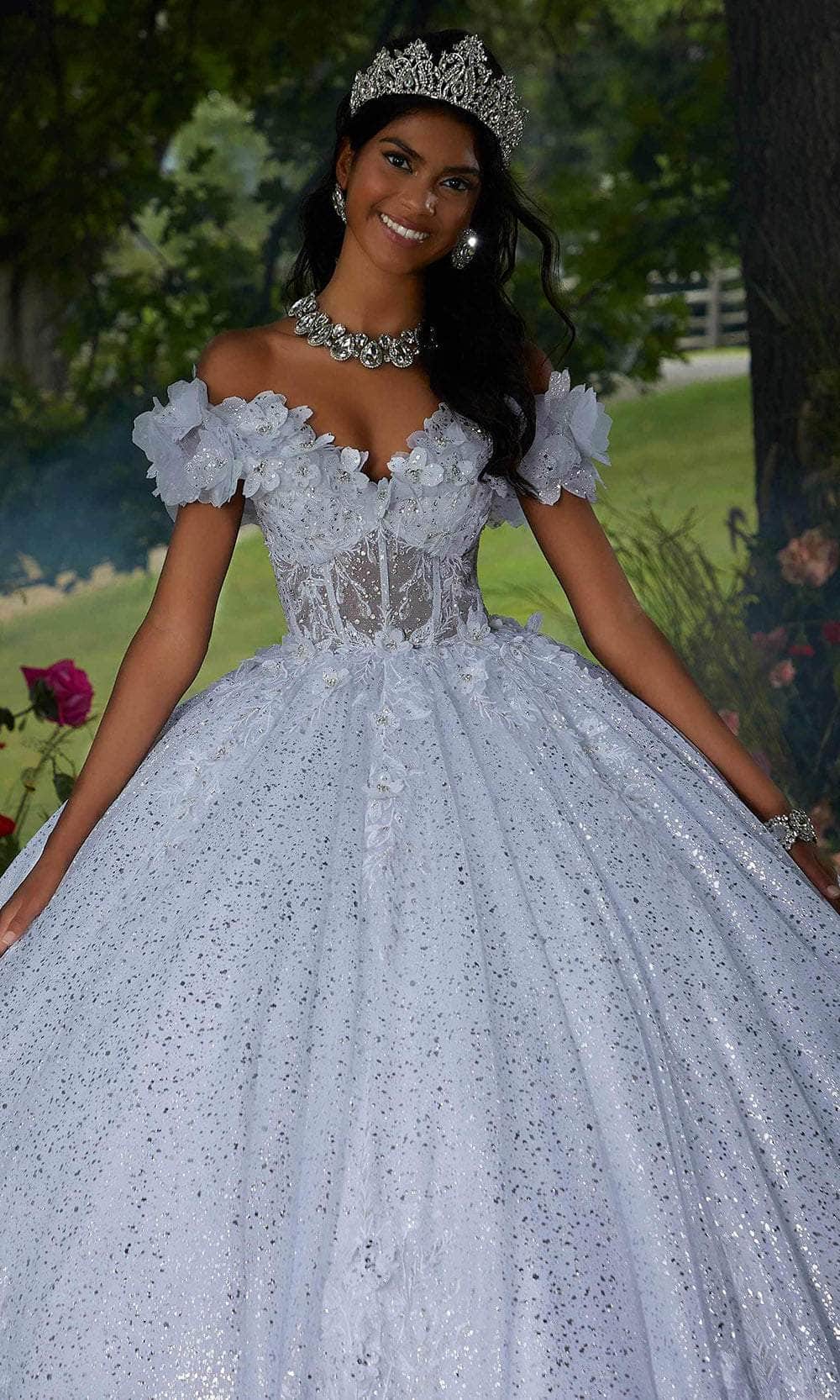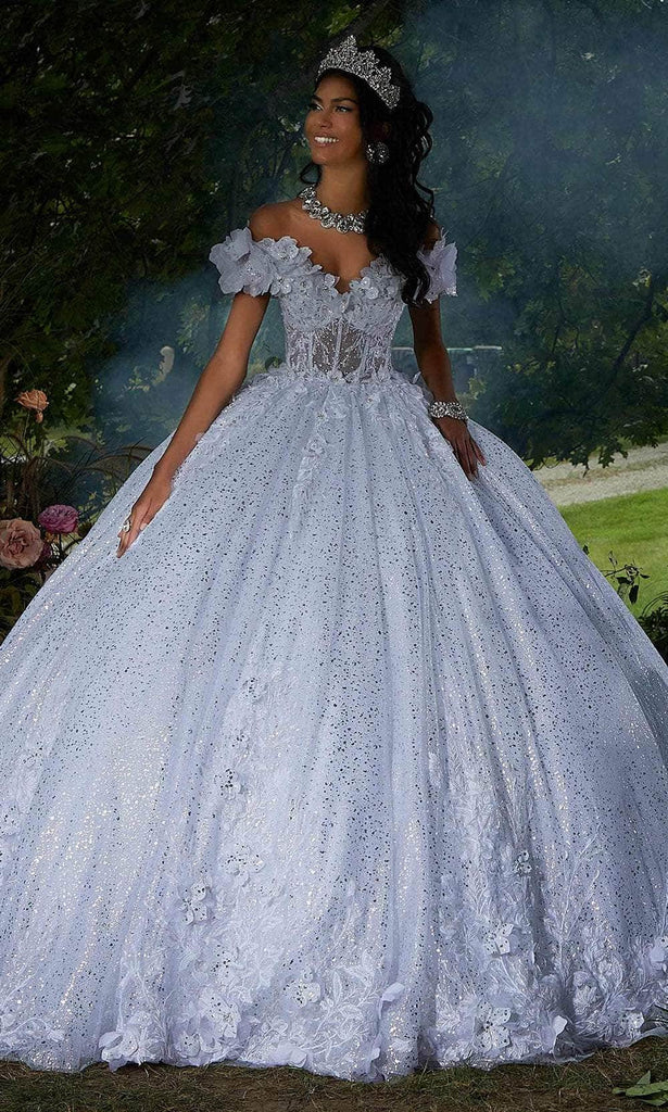 Embark on a journey of glamour with Mori Lee 34102, a dazzling ball gown that captivates at every turn. The sheer bodice, adorned with corset boning, showcases an off-the-shoulder neckline adorned with enchanting three-dimensional floral embroidery. Crystal beading imparts a breathtaking sparkle to both the bodice and the florals, leading the way to a metallic foil-printed tulle skirt. Cascading florals further enhance the allure of the skirt, while a lovely detachable back bow adds the perfect finishing touch to this mesmerizing ensemble. Mori Lee 34102 is vision of refined elegance. Model is Wearing White/Silver color.