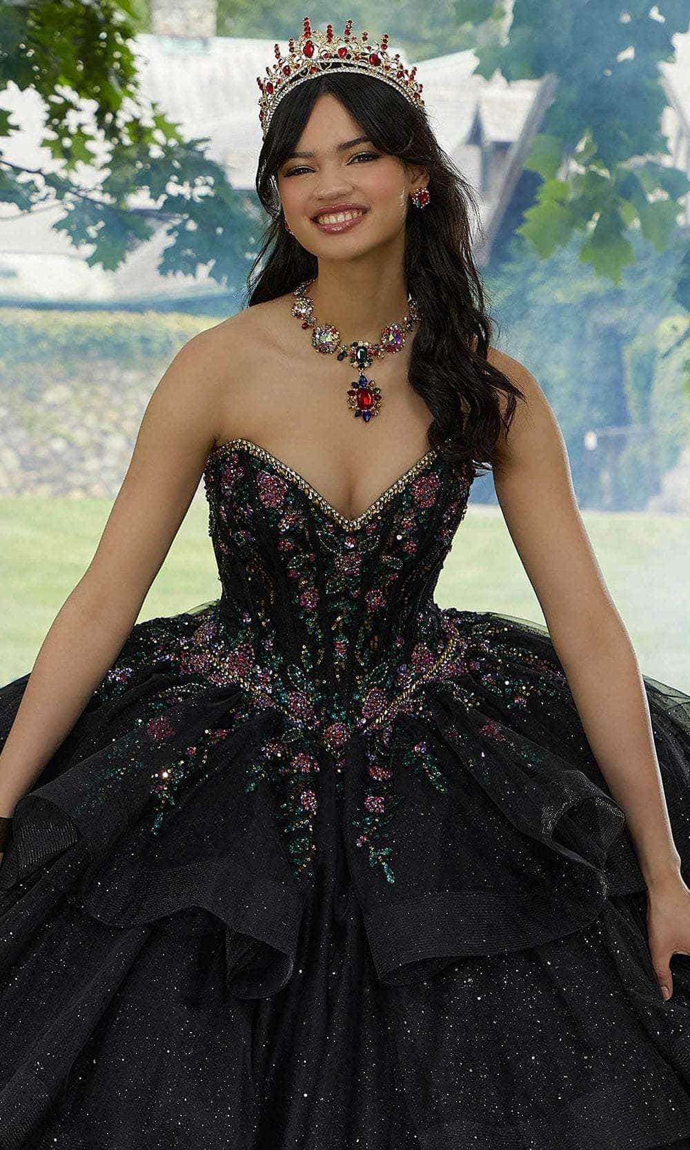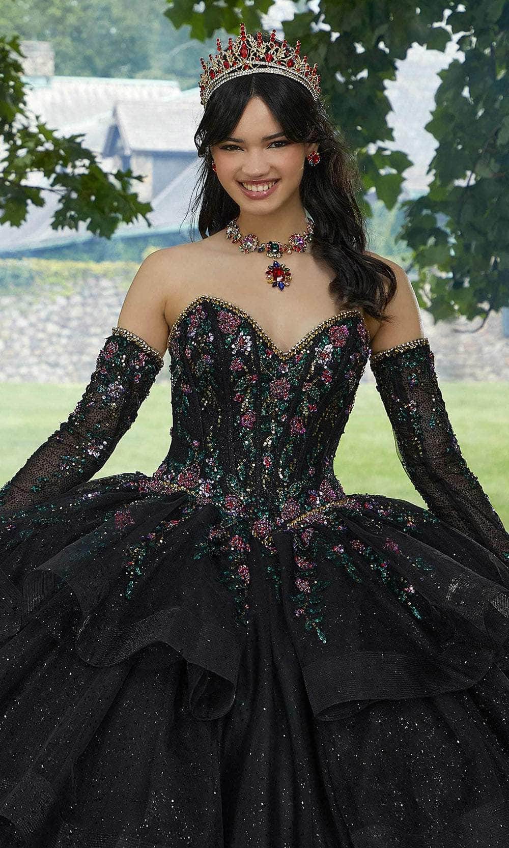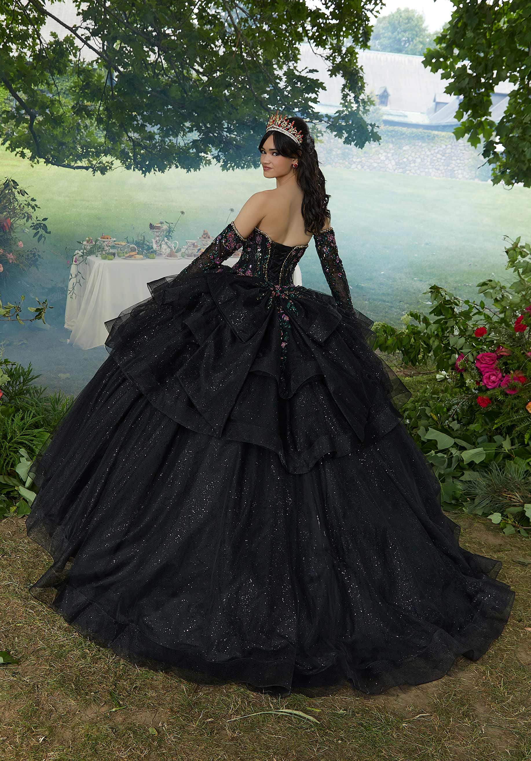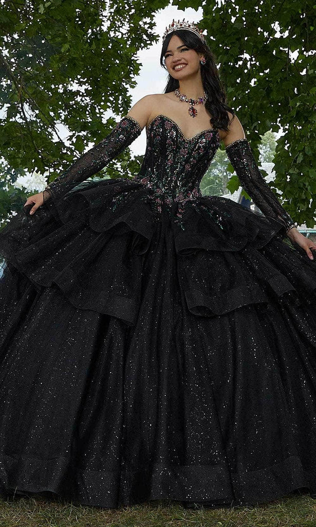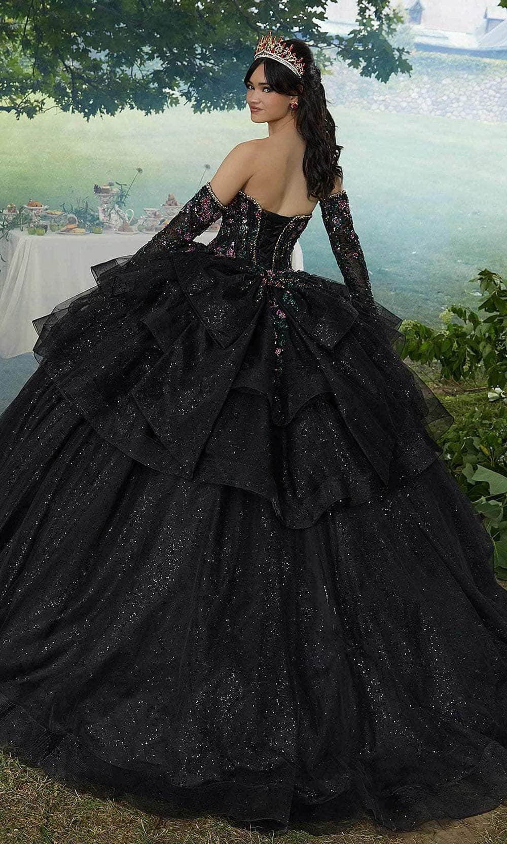 Bloom with loveliness in this detailed gown from Mori Lee 34104, a stunning ballgown that captures attention. The corset bodice, featuring a sweetheart neckline and delicate draped tulle accent, leads to detachable off-the-shoulder sleeves for a touch of versatility. Crystal beading glistens on sparkling patterned sequins, enhancing the beauty of the abstract floral patterned glitter tulle. The horsehair-edged skirt overlay introduces texture and drama, creating a mesmerizing silhouette. This enchanting Mori Lee 34104 is completed with a matching stole, ensuring an unforgettable presence for your special quinceañera celebration. Model is wearing Black/Multi color.