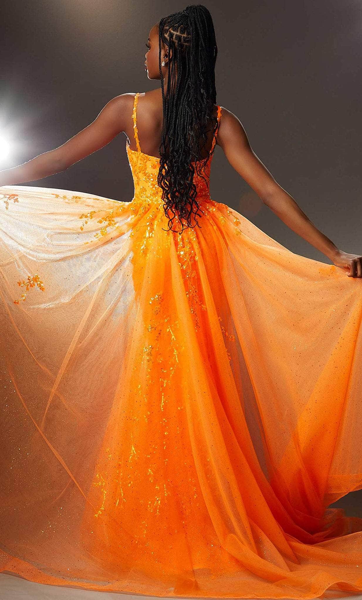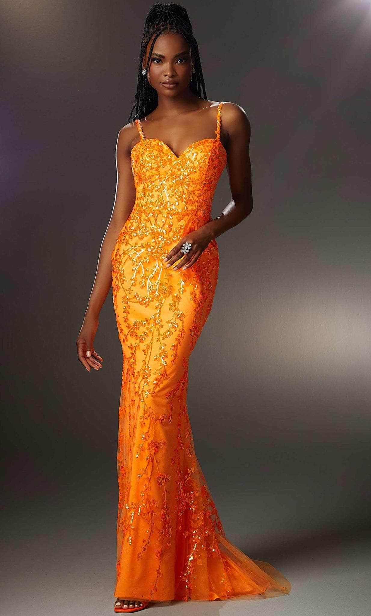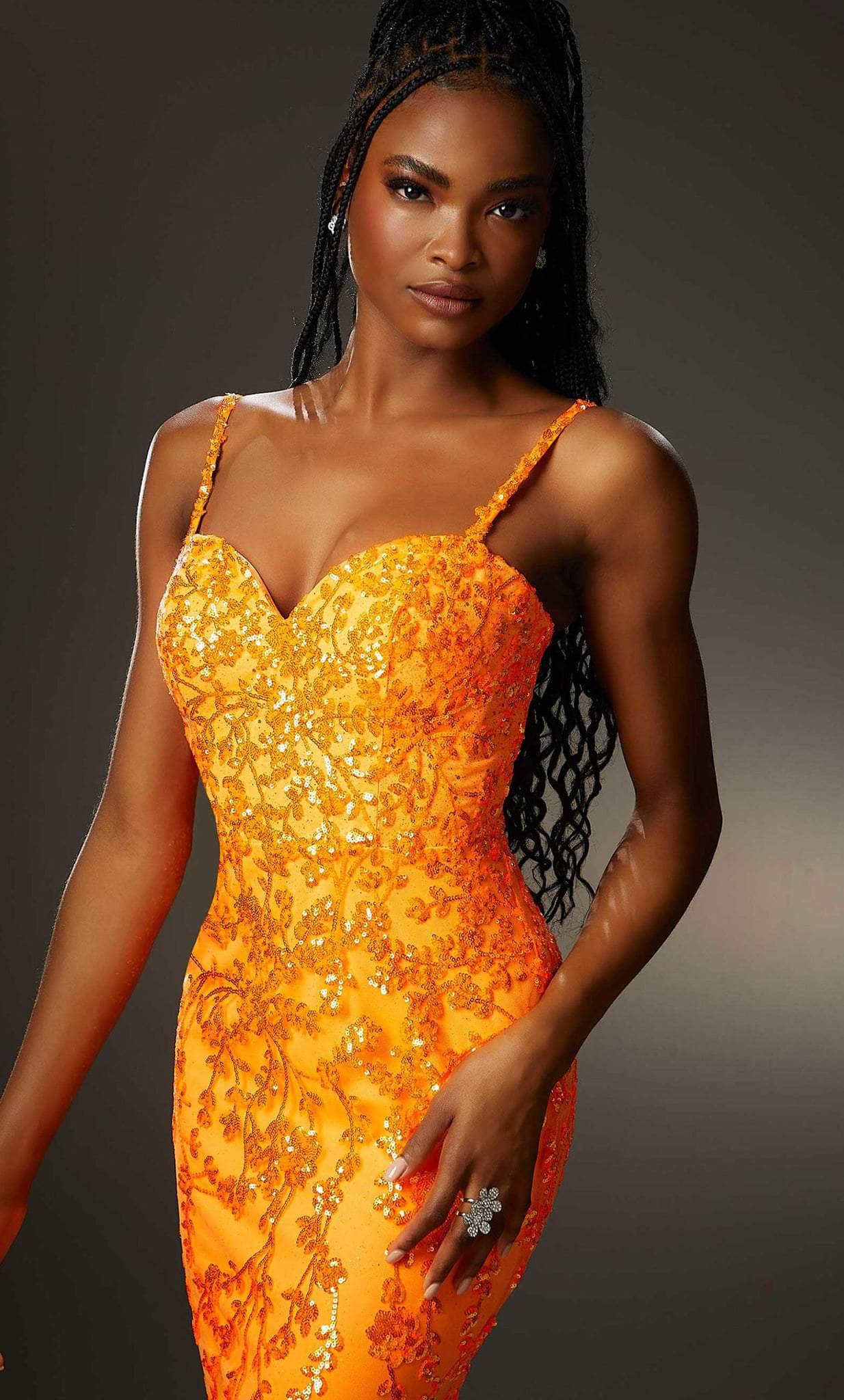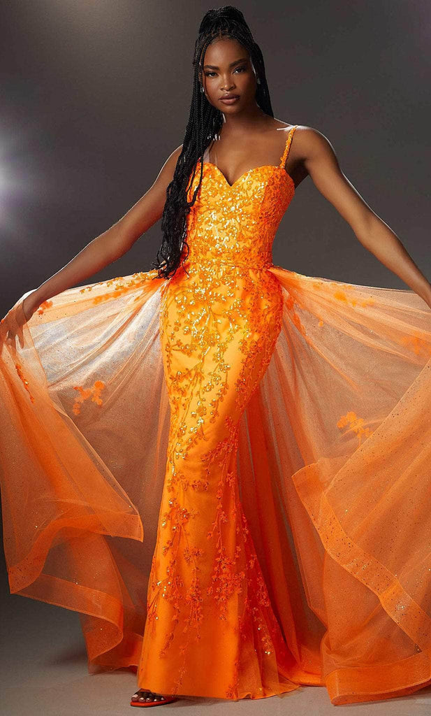 With this graceful and youthful Mori Lee 48040 dress, move forward with assurance. This magnificent long dress has a sleeveless bodice with botanical-inspired patterned sequin embellishment crowned with a sweetheart neckline and side cut-outs that perfectly match the stunning back as it is accented with a cut-out and a stylish lace-up tie for a perfect fit. The mermaid silhouette cascades to the full-length hem and sweeping train. In this bedazzled evening dress by Mori Lee 48040, you will be ready for a perfect and fantastic evening. Models are wearing Neon Orange and Neon Pink colors.