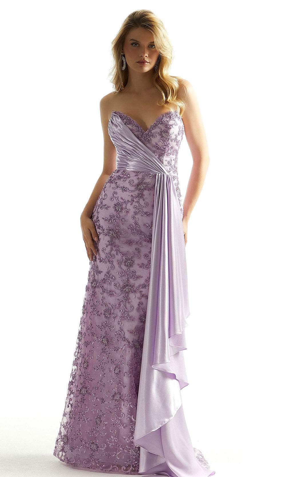 Show off your classy style when you wear this Mori Lee 49082 dress, a vision of elegance. Adorned with intricate embroideries and glistening sequins, the strapless corset bodice showcases meticulous pleated details and a captivating sweetheart neckline. Secured by a central zipper closure at the back, the dress offers a seamless fit. The floor-length skirt gracefully flows in a sheath silhouette, completing the ensemble with a touch of sophistication and timeless charm, making the Mori Lee 49082 a stunning choice for any special occasion. Models are wearing Champagne and Light Purple colors..