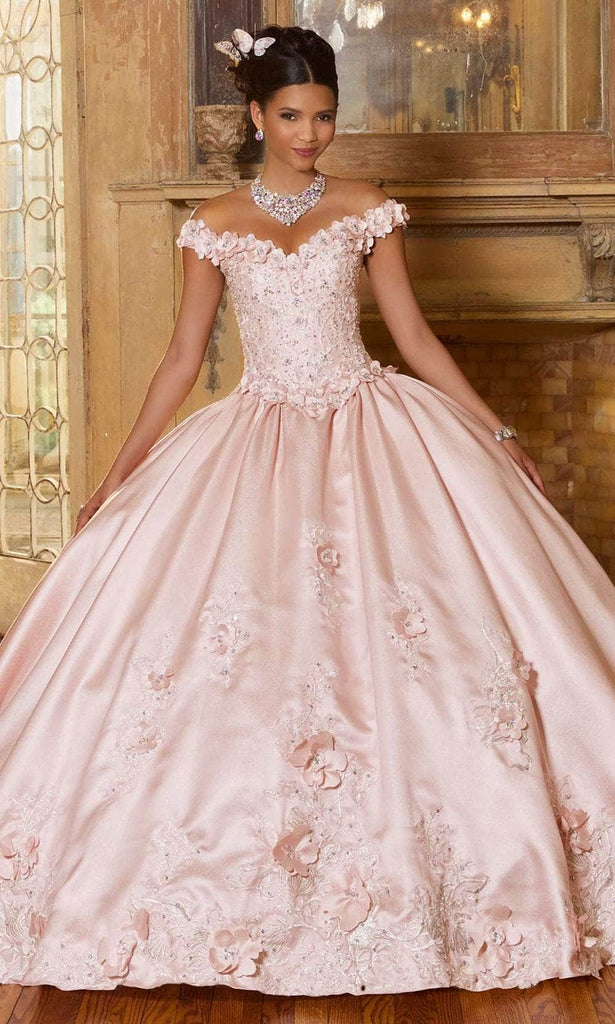 Walk the red carpet in style wearing this stunning Mori Lee 60153 creation. This beautiful quinceañera dress in luxe Diamanti satin gown features a lovely off-the-shoulder bodice designed with crystal beadworks. It is embellished with embroidery with bead applique on the bodice and stunning three-dimensional flowers cascading down the full ball gown. The back of the dress features a lace-up closure design. Leave them speechless with this Mori Lee 60153 masterpiece. Models are wearing Blush and Ivory/ Blush Colors