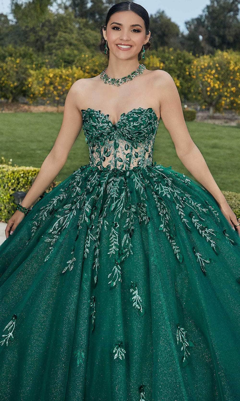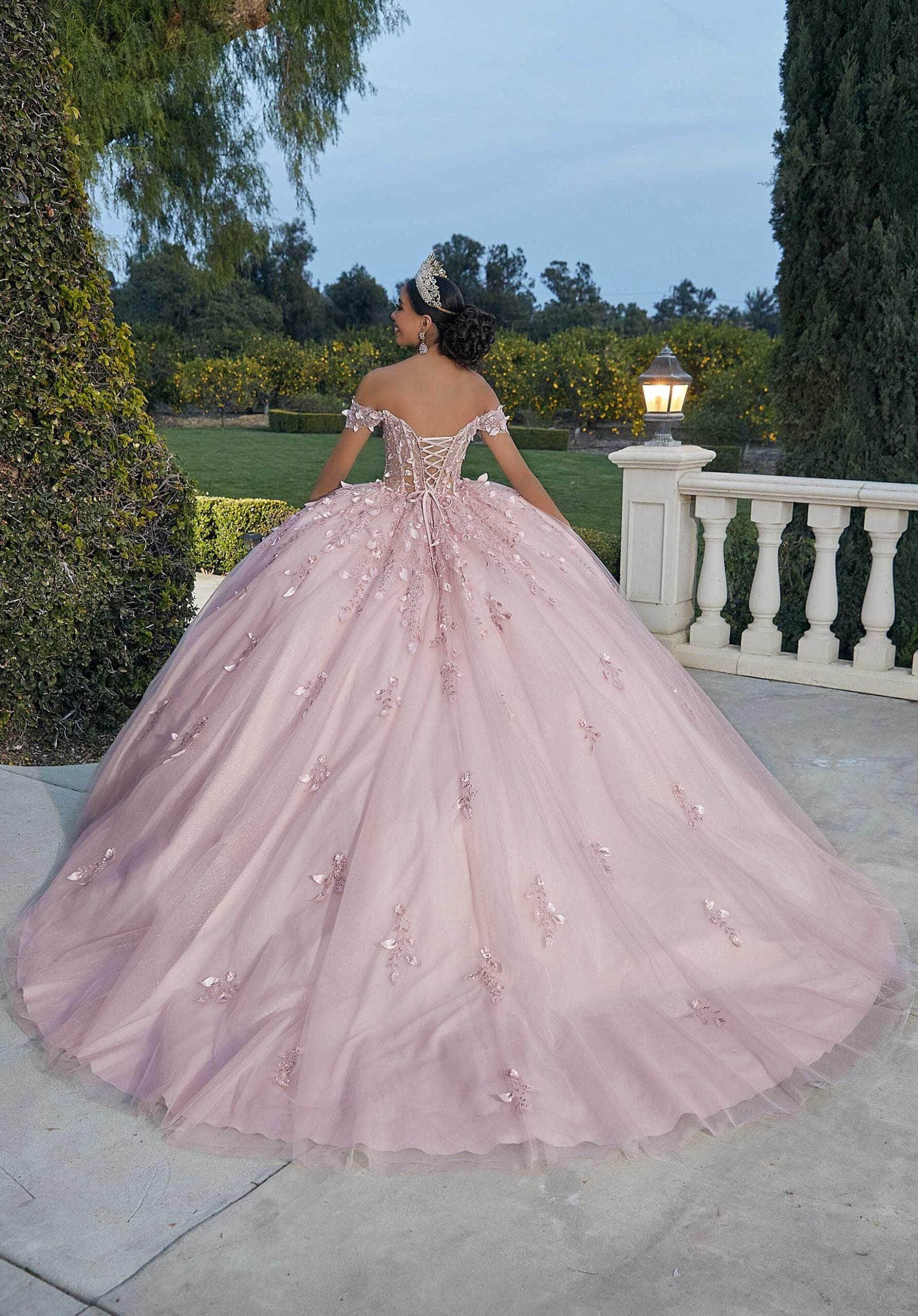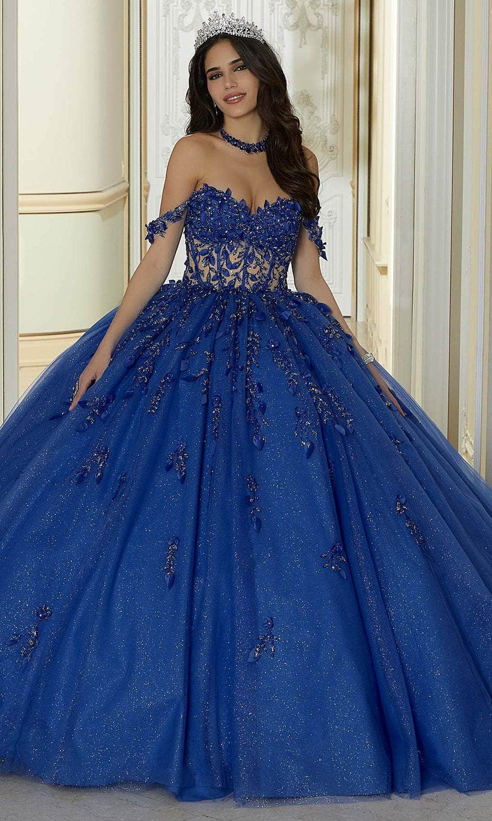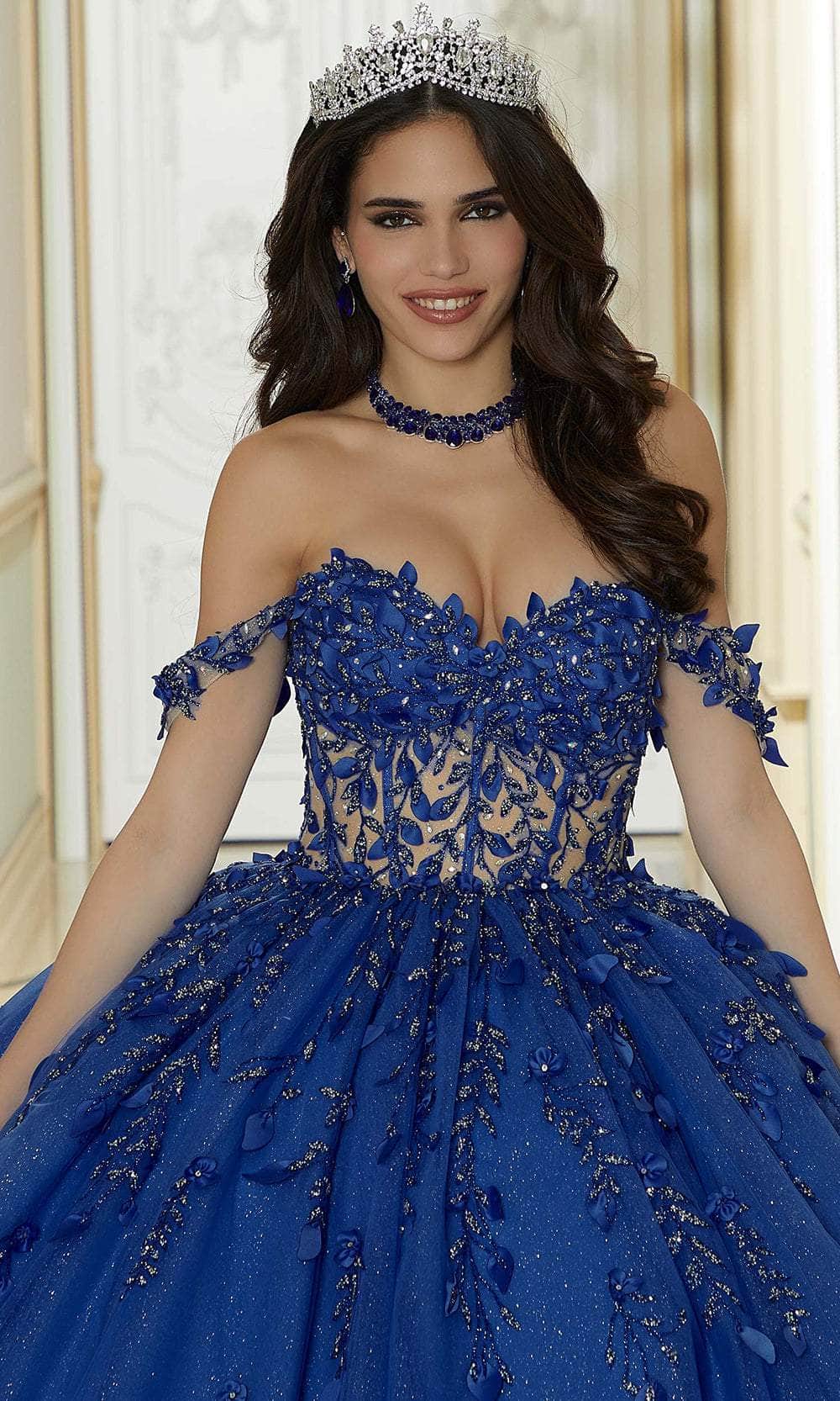 Wrap yourself in ultimate luxury with this Mori Lee 60181 masterpiece. This strapless gown is designed to turn heads, crafted from glitter tulle fabric and detailed with glitter embroidery. It is also adorned with 3D floral and foliage appliques, and a sprinkled crystal beading. Its sweetheart neckline and sheer corset bodice exude an irresistible charm. The open back is beautifully secured with an adjustable lace-up tie, providing both style and a snug fit. For added versatility, a detachable off-shoulder sleeve is included, along with a matching stole. The skirt boasts a voluminous ballgown silhouette that cascades into a chapel train, perfect for a breathtaking entrance. Reign as a princess in this Mori Lee 60181 gown. Models are wearing Regal Royal, Bahama Blue, Blush/Rose Gold, and Emerald colors.