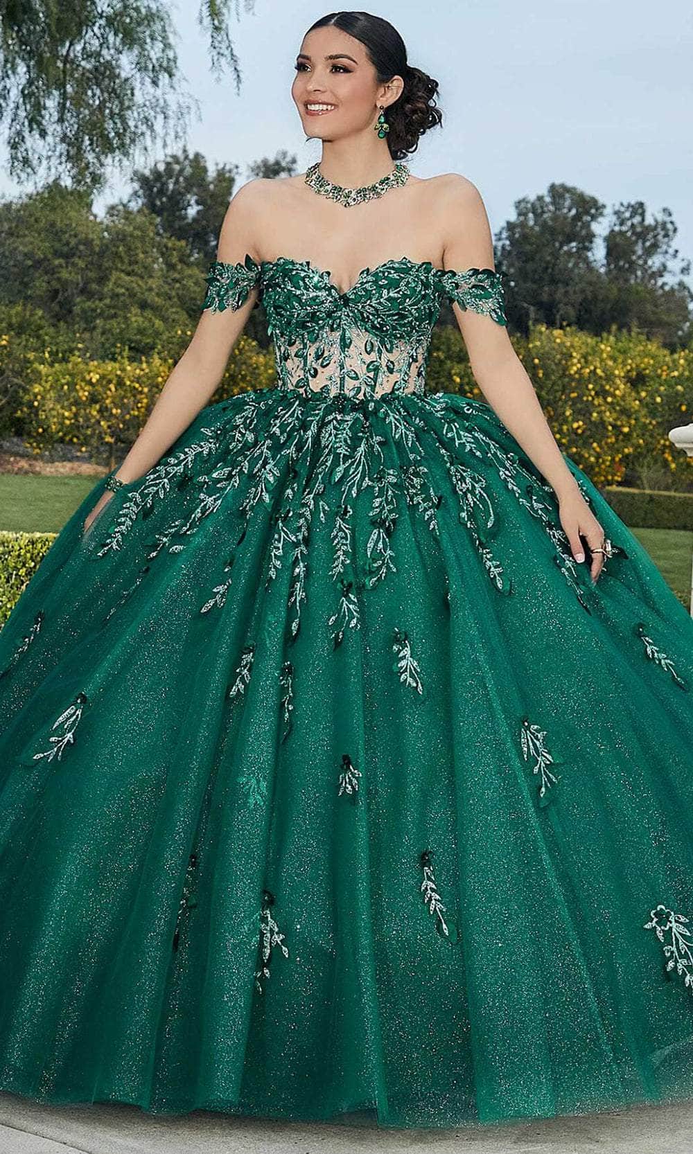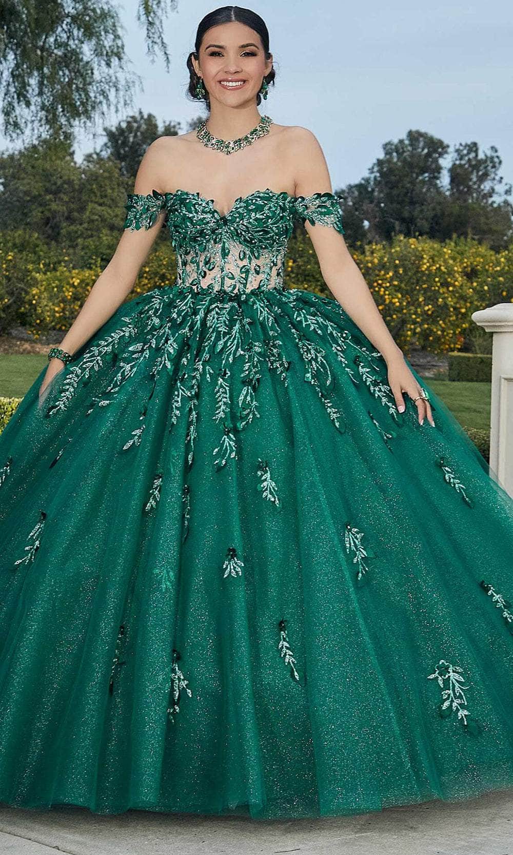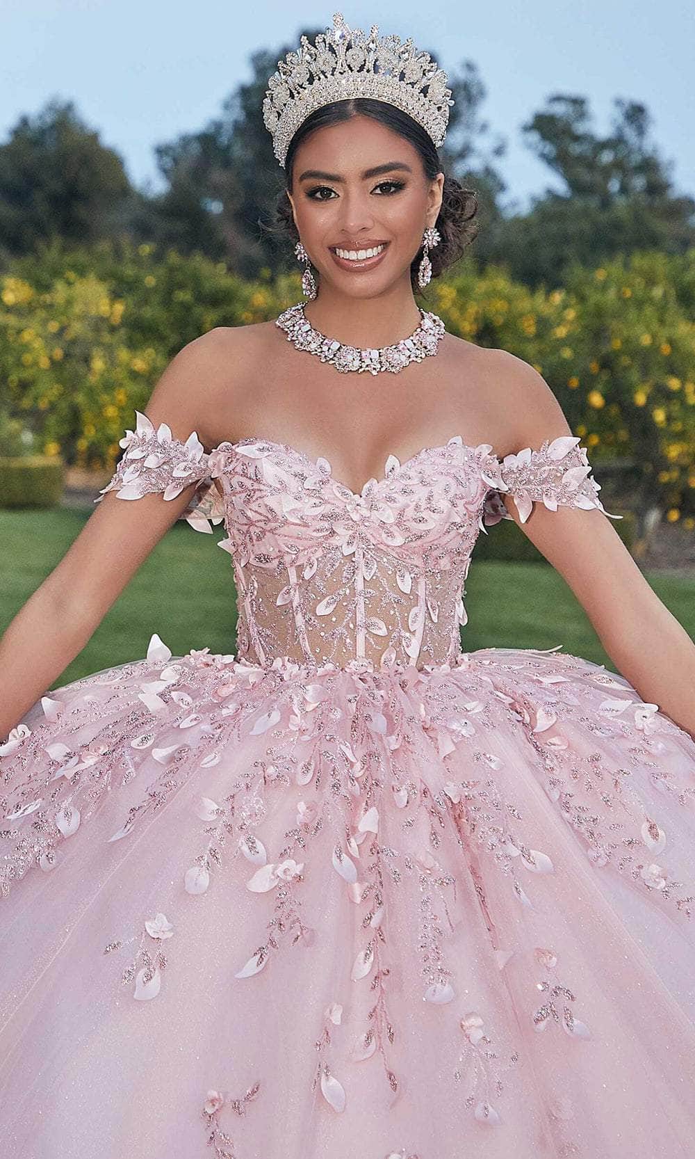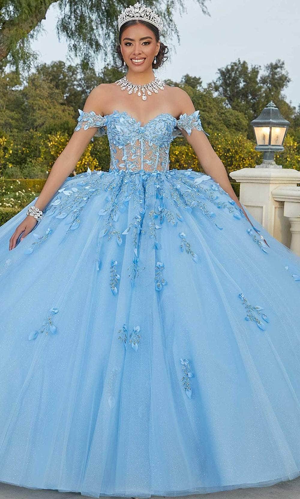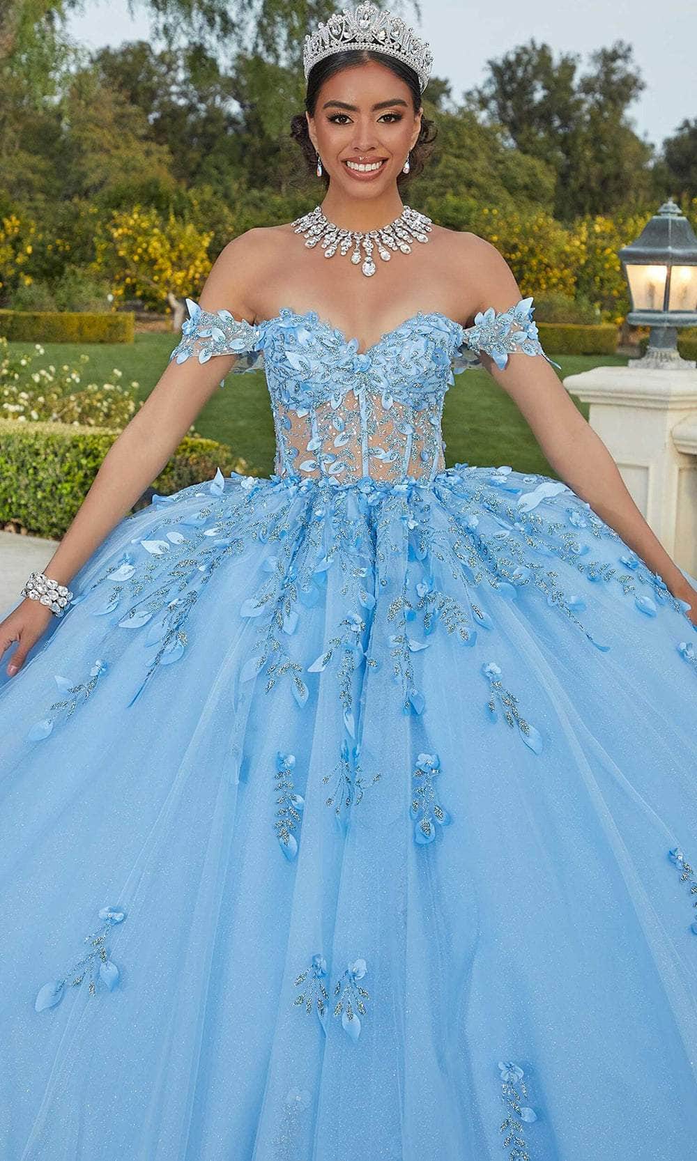 Wrap yourself in ultimate luxury with this Mori Lee 60181 masterpiece. This strapless gown is designed to turn heads, crafted from glitter tulle fabric and detailed with glitter embroidery. It is also adorned with 3D floral and foliage appliques, and a sprinkled crystal beading. Its sweetheart neckline and sheer corset bodice exude an irresistible charm. The open back is beautifully secured with an adjustable lace-up tie, providing both style and a snug fit. For added versatility, a detachable off-shoulder sleeve is included, along with a matching stole. The skirt boasts a voluminous ballgown silhouette that cascades into a chapel train, perfect for a breathtaking entrance. Reign as a princess in this Mori Lee 60181 gown. Models are wearing Regal Royal, Bahama Blue, Blush/Rose Gold, and Emerald colors.