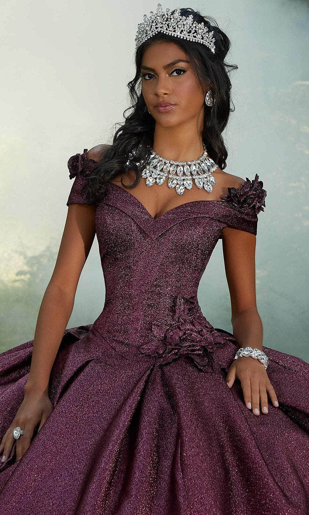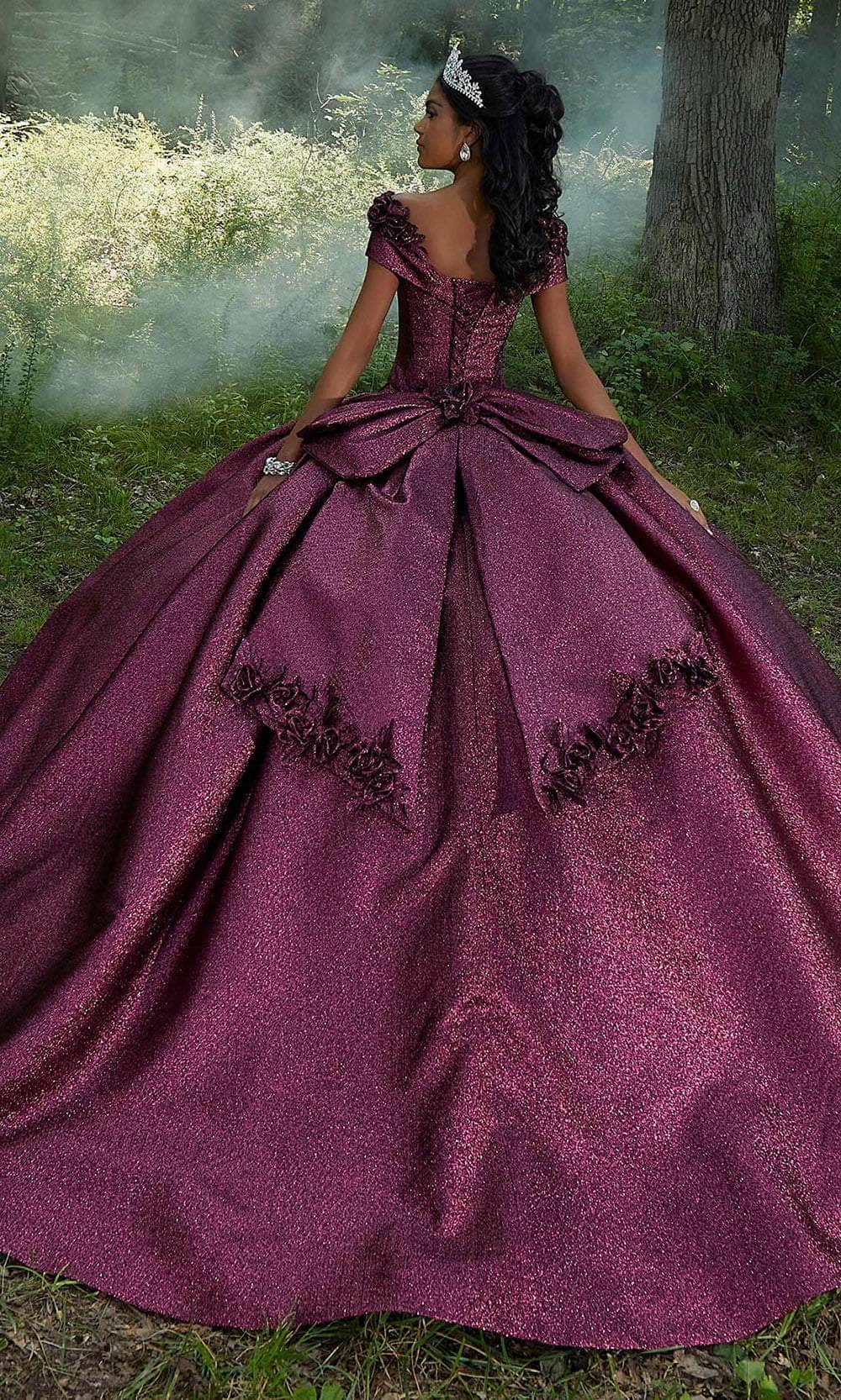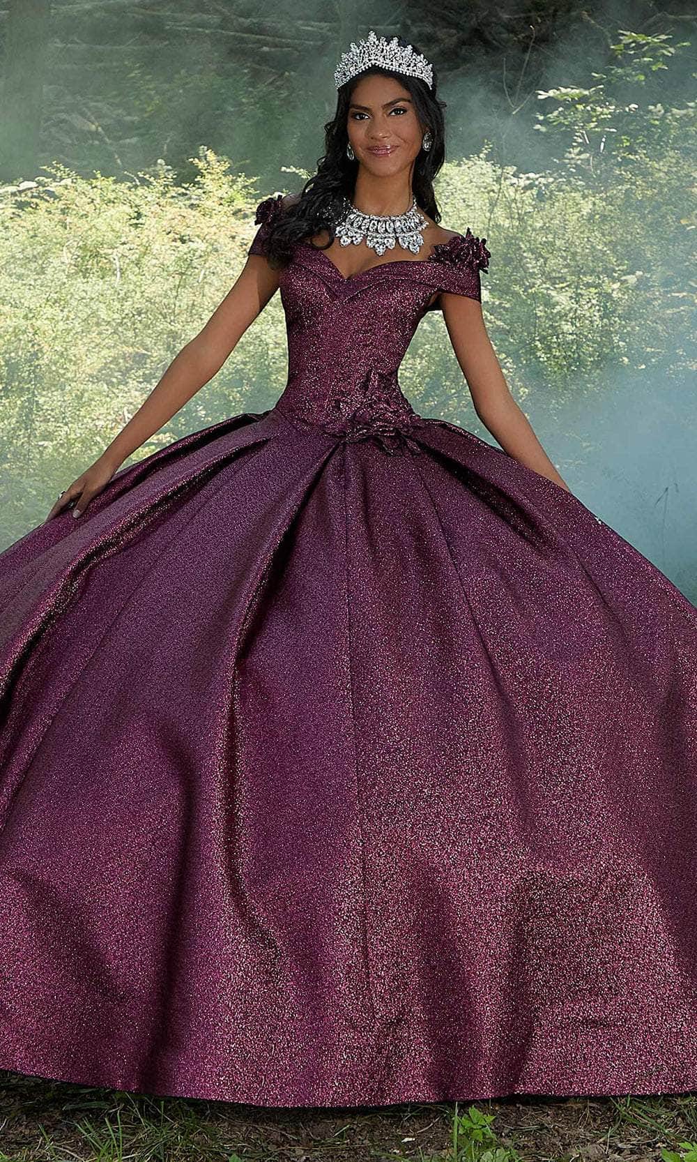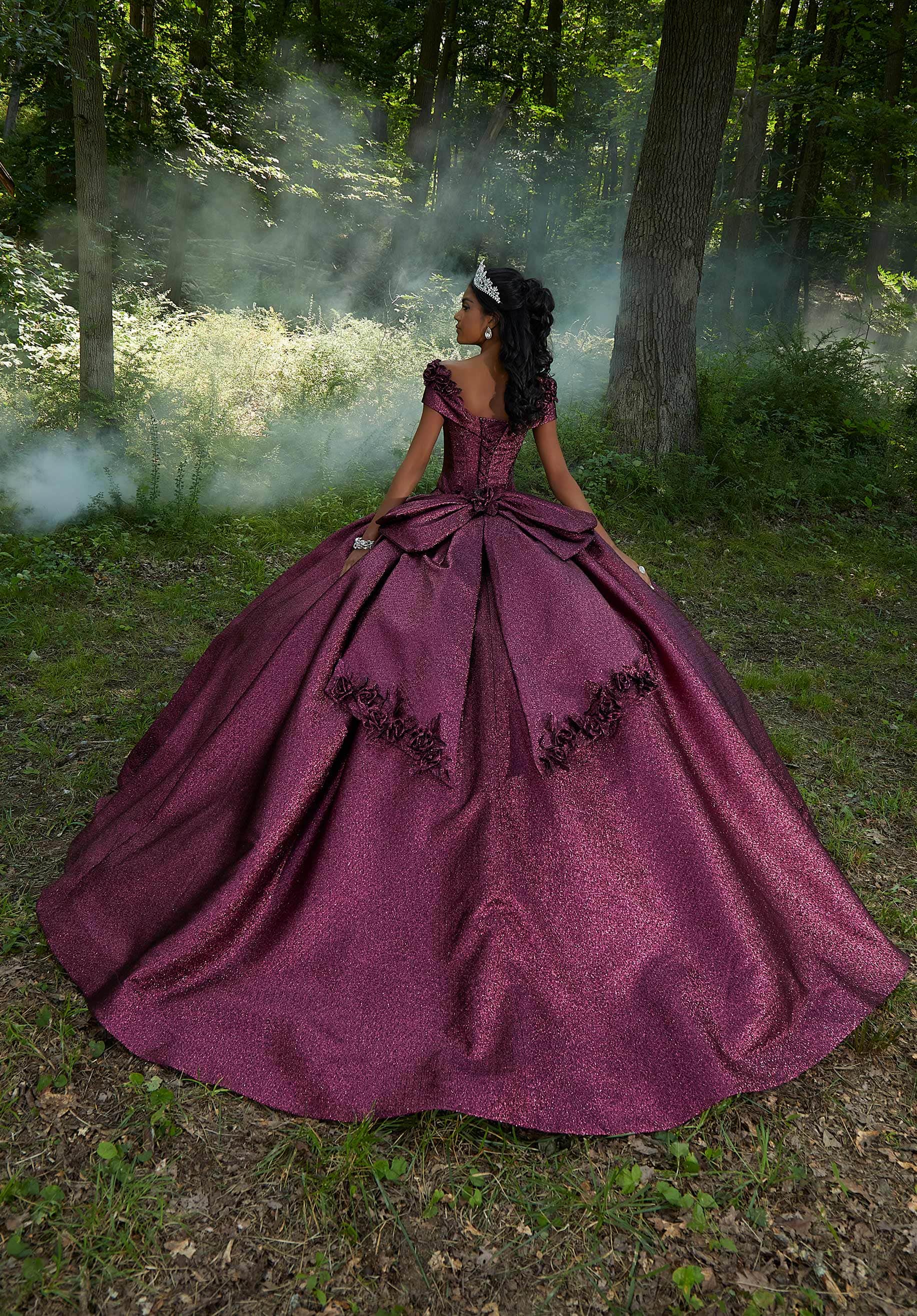Enter grandeur with Mori Lee 60196, a spectacular ball gown that commands attention. The structured bodice, adorned with contoured seams, showcases a delightful cuffed off-the-shoulder neckline and a Basque waist embellished with beautiful three-dimensional flowers. The unique pleated shimmer fabric exudes a stunning glow, crafting a delicate texture on the voluminous dress. Completing the look is a sweet bow in the back, adorned with three-dimensional flowers, adding a charming touch to this magnificent ensemble. Mori Lee 60196 is a masterpiece of elegance and allure. Models are wearing Shimmer Rose and Shimmer Wine colors.