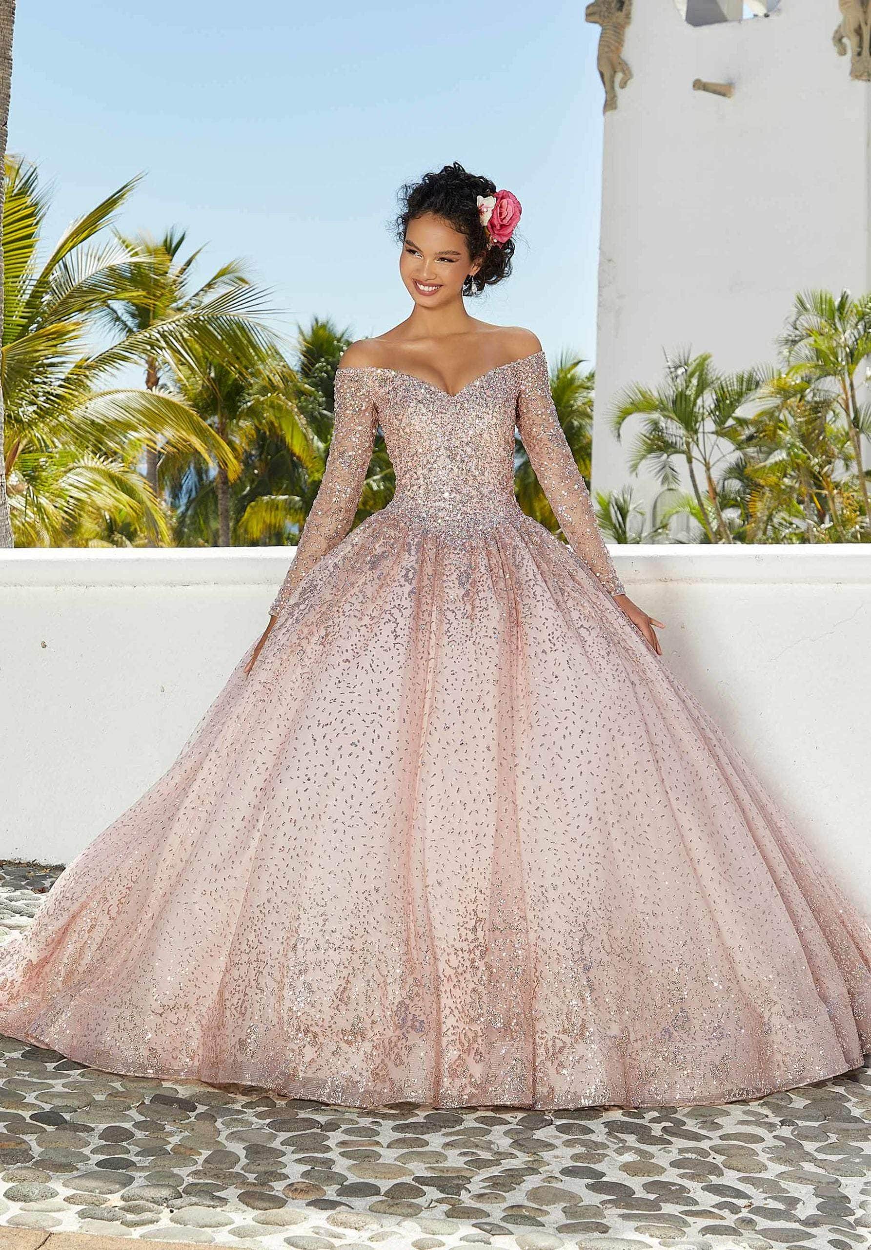 Showcase your brilliant esprit in this Bellissima quinceanera dress from Mori Lee 89355 creation. This dress is wholly adorned with crystal beading all over and has an off-the-shoulder neckline, long sleeves, and a lace-up back design for the closure, while the skirt ends in a floor-length hem for added drama. Turn yourself into a head-turning beauty by slipping into this eye-catching quinceanera dress from Mori Lee 89355. Models are wearing Blush/Rose Gold and Sangria/Gold colors.
