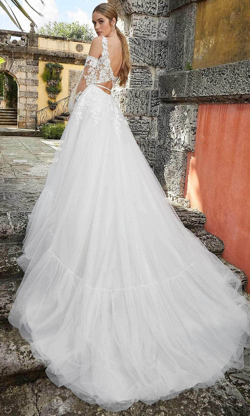 Bloom like the goddess on your wedding day in this Felicita Bridal by Mori Lee 6978 creation. The bodice of this A-line bridal gown is covered in lace embroidery, a V-neckline, and a low V-back that has a keyhole and a thin band. For an added dose of stylistic flair, this gown comes with a bishop sleeves that can be removed. This ruffle hem and chapel train are the perfect finishing touches for this soft net dream wedding dress. Glamour up with captivating style in this Mori Lee bridal creation. Available in three lengths: 55 inches, 58 inches, and 61 inches. Model is wearing Ivory/Champagne/Honey color.
