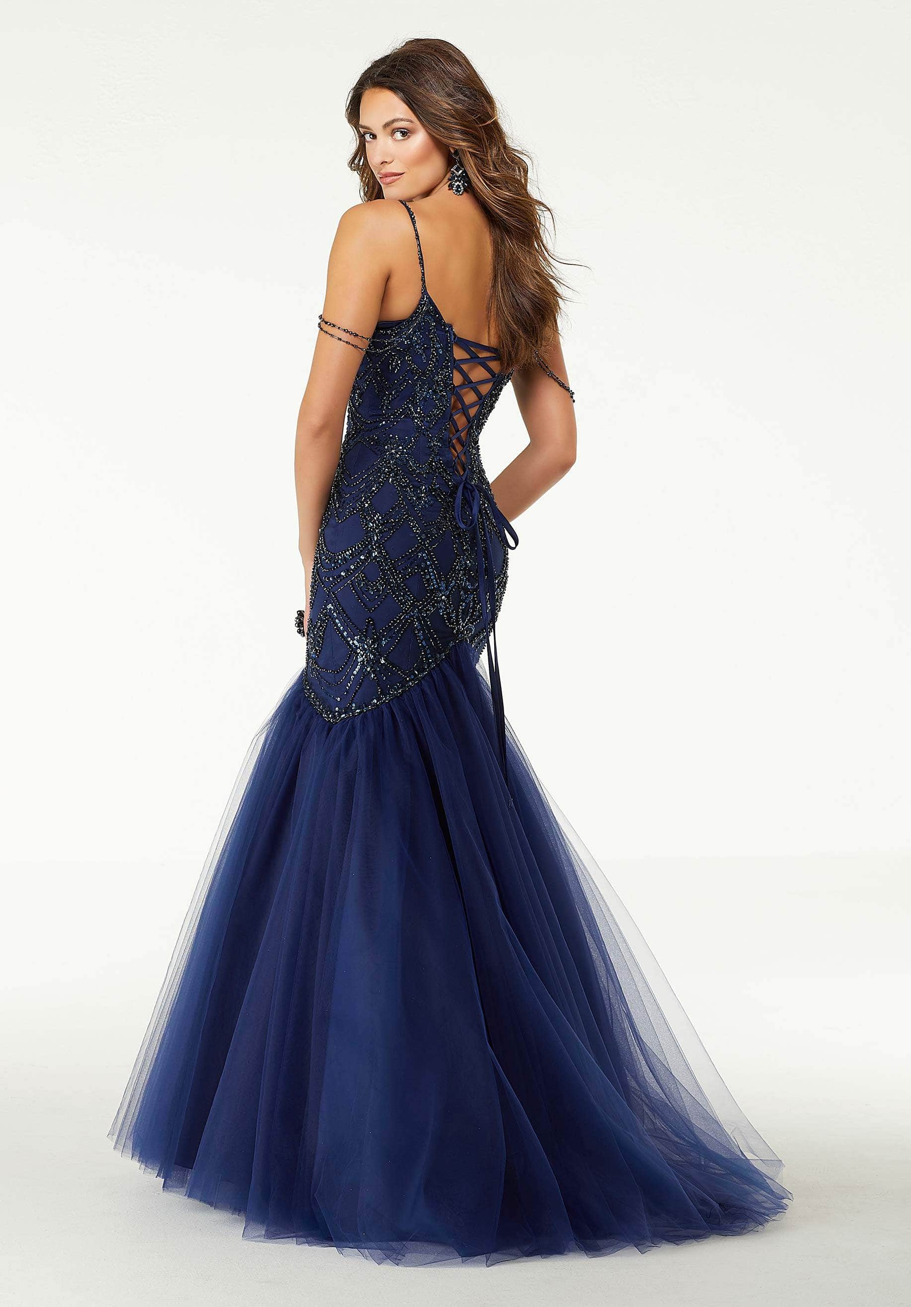 Dominate this luxurious event as you saunter into the ballroom with sass and allure in this chic Mori Lee 45042 evening dress. This long dress mesmerizes in a sleeveless, scoop neckline with spaghetti and chandelier straps. The dress is lavishly adorned with glittering crystal beading. It has a lace up back and a tulle mermaid skirt that finishes in a sweep train. This Mori Lee dress is sure to create a striking look that is sure to make anyone remember your grand entrance.