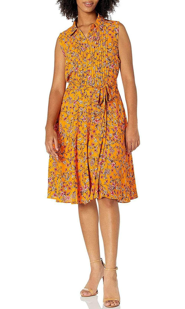 Look fresh and pretty in this creation by Nanette Nanette Lepore NM9K171J3. Boasts a sleeveless and collared V neckline, the entire dress is styled in floral multi-print and pleated detail. The full back is enclosed with a center zipper closure and it has a button down in front. This dress comes with a tie that fastens in the front to give you a shape and the A-line skirt finishes in the knee-length hemline. This Nanette Nanette Lepore dress will absolutely make you feel special! Couture Candy is committed to provide the very best when it comes to dresses for every occasion, and we are delighted to have Nanette Nanette Lepore on our side to aid us in delivering exquisite dresses for various occasions that are sure to make heads turn. Model is wearing the Yellow color.
