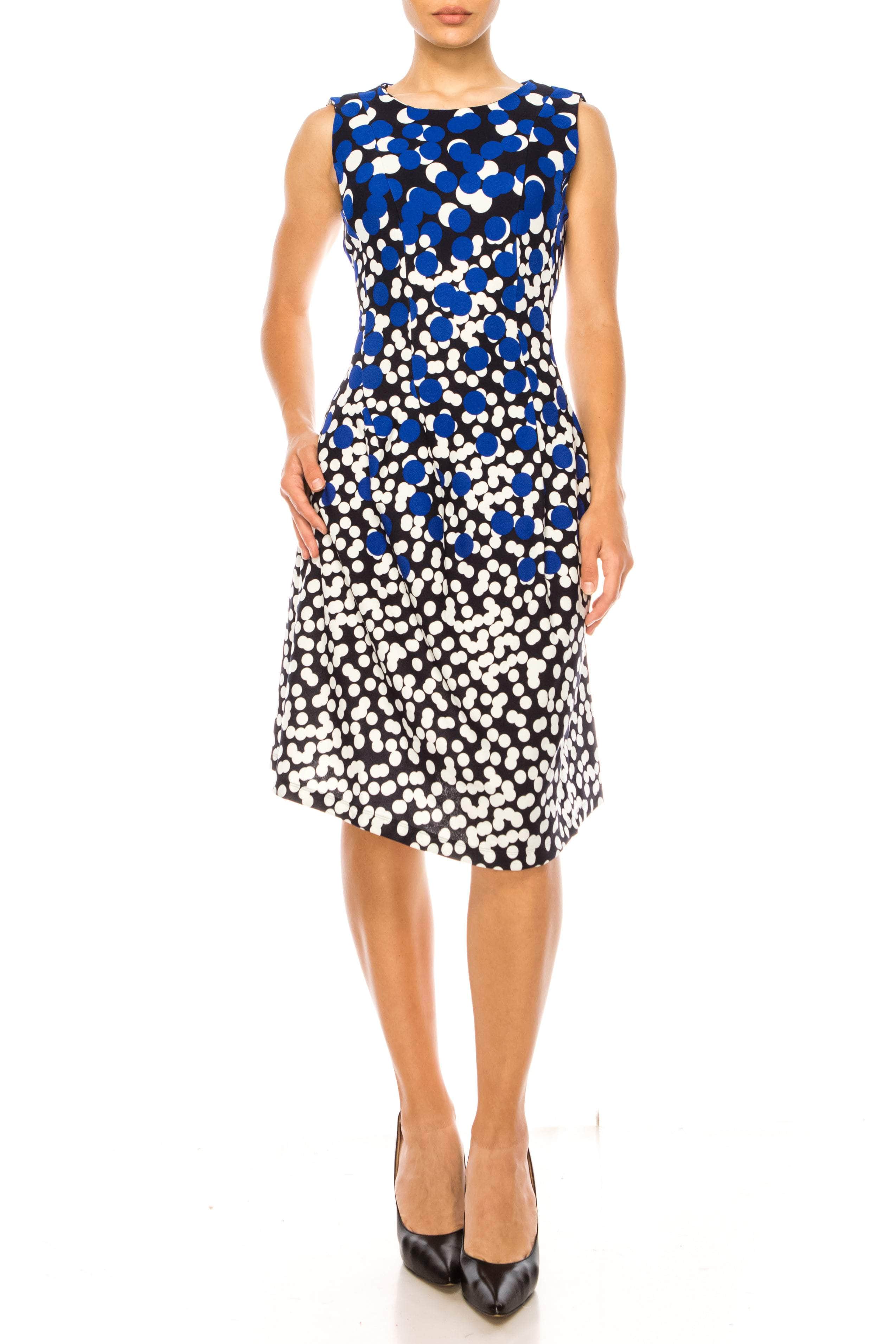 Crafted with attention to detail and a passion for design, this New Yorker's Apparel SCP896C dress, is a treat to behold. Carefully crafted with meticulous attention to detail and made from intricately printed scuba crepe fabric in a dotted motif, this sleeveless dress enhances the female figure with precisely tailored seams. Highlighting a jewel neckline and a sleeveless bodice, the ensemble is completed with a full back and a discreet zipper closure for a polished look. The A-line silhouette elegantly falls to a hem below the knee. Add an enchanting touch to any event with our captivating New Yorker's Apparel SCP896C creation, exuding irresistible charm. Models are wearing the Cobalt Navy, Magenta Navy, Orange Navy, and Yellow Navy colors.