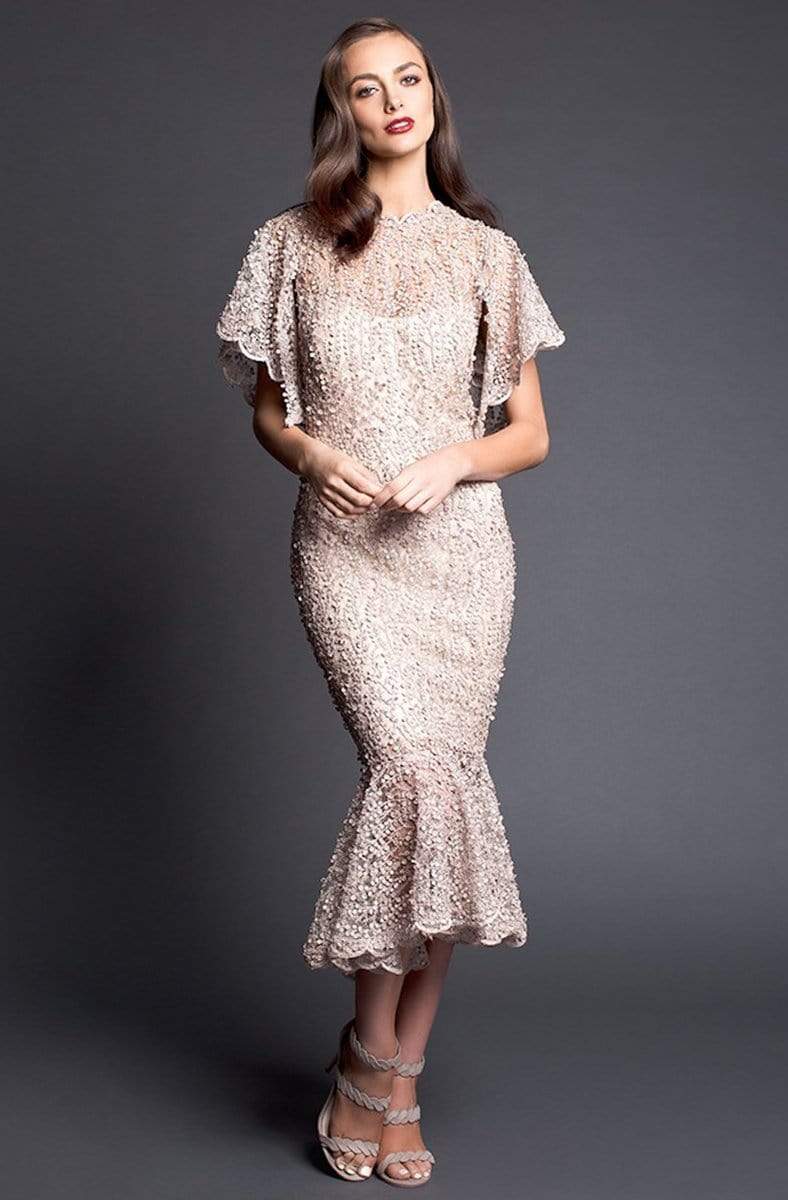 eFlourish sophisticated elegance at your opulent gathering in this impeccable Nicole Bakti 663 creation. Exquisitely festooned with a textured lace silhouette, this dress charms with a scallop-trimmed jewel neckline and delicate flutter sleeves. Structured with a fitted lining, the tea-length mermaid skirt skims hips and flares into a scallop-trimmed hemline. Make a charming statement in this Nicole Bakti masterpiece. Model is wearing the Taupe color.