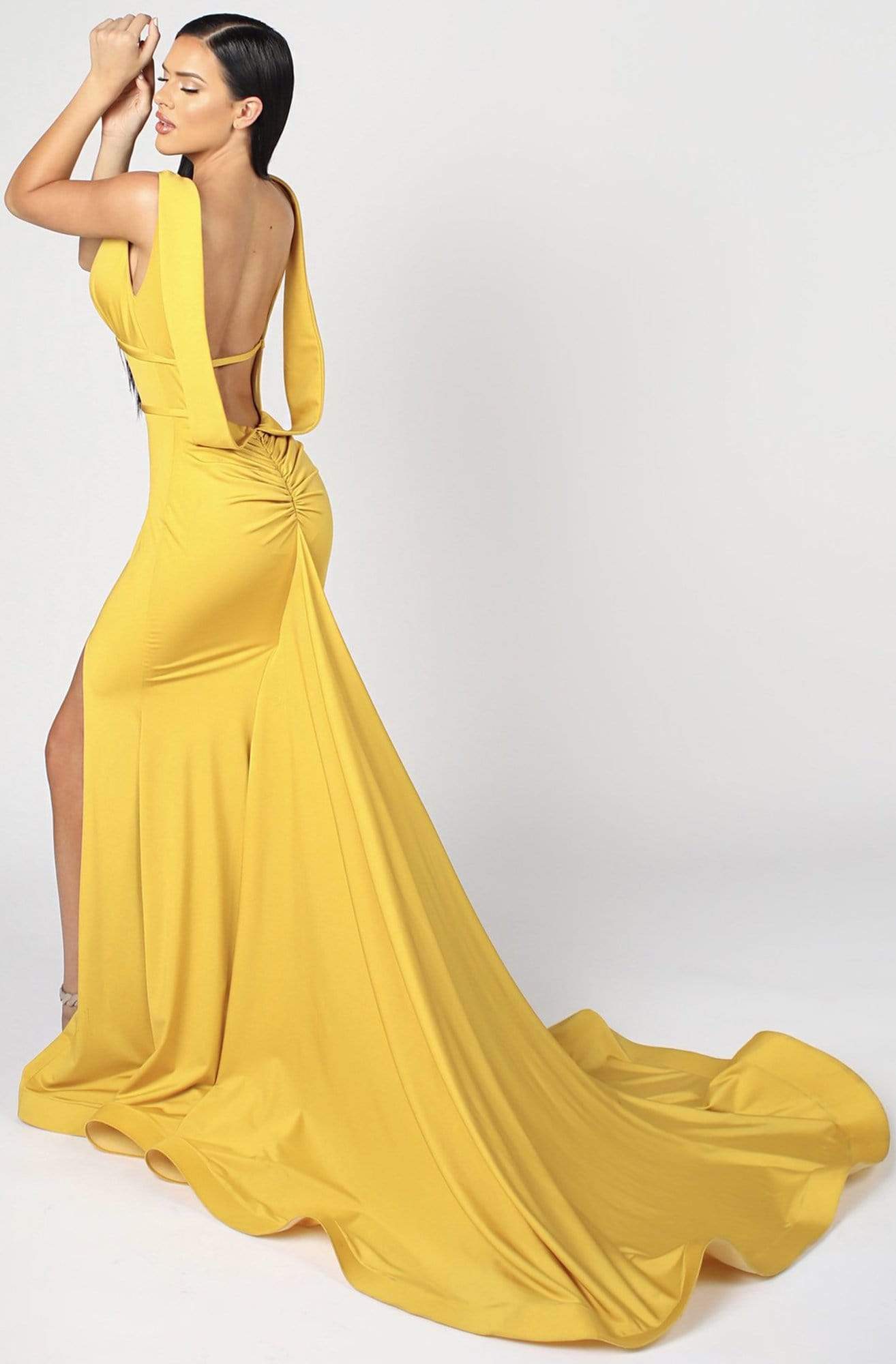 | Details: | Sleeveless, Plunged neckline, Low cut open back, Wide shoulder straps, Ruched back, Chapel train, Horsehair hem |