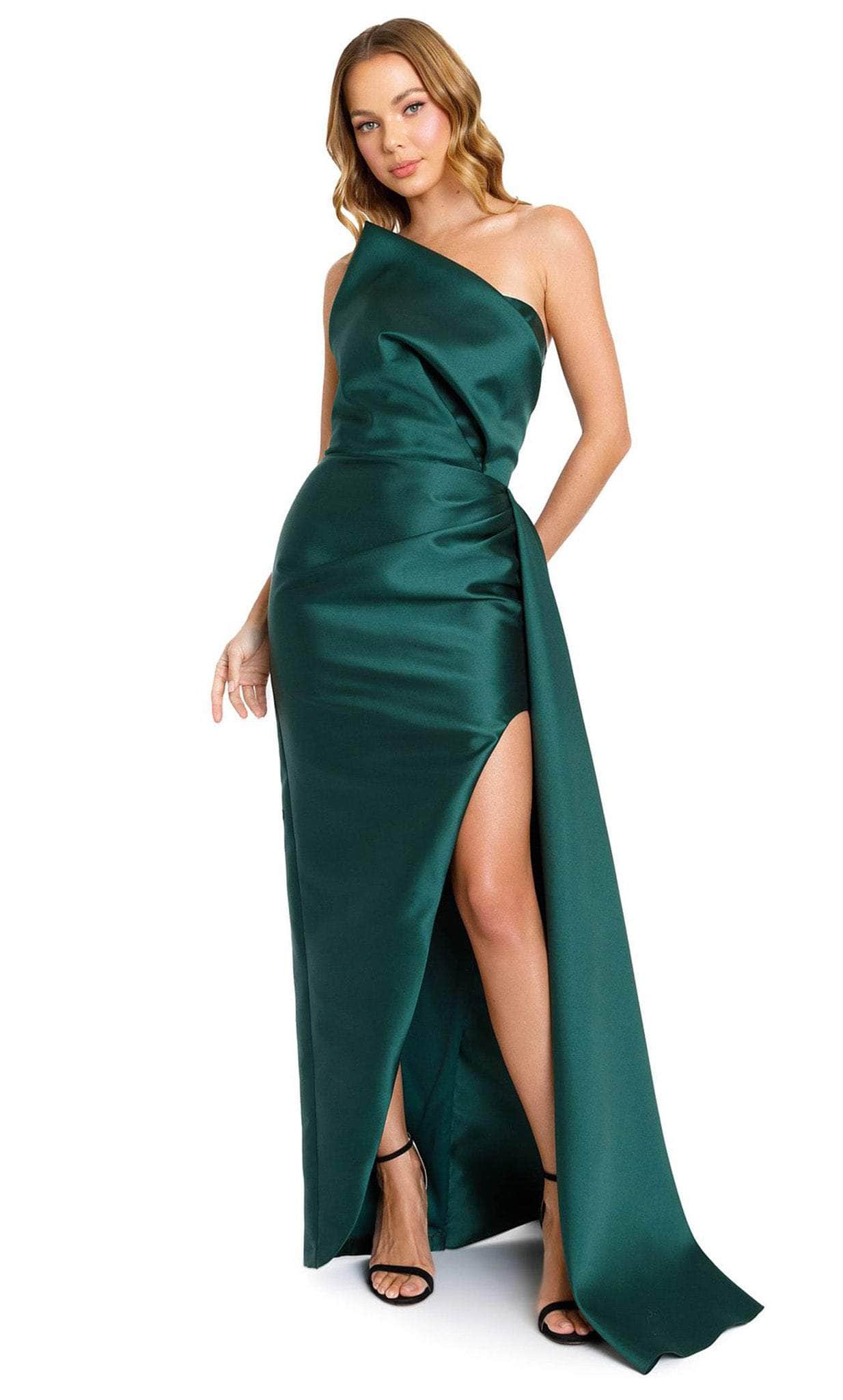 Parade an elegant and glamorous style in this Nicole Bakti 7205 masterpiece. Expect everyone to turn around and look at you as you enter the red carpet with this dress featuring a strapless asymmetric neckline and brocade bodice. This also shows an overlay, making the dress look more ethereal. You will have your figure to be highly flattered in this sheath-silhouette outfit, having a slit to make the dress look more majestic. Make it a night to remember with this creation from Nicole Bakti N7205. Model is wearing Hunter Green color.