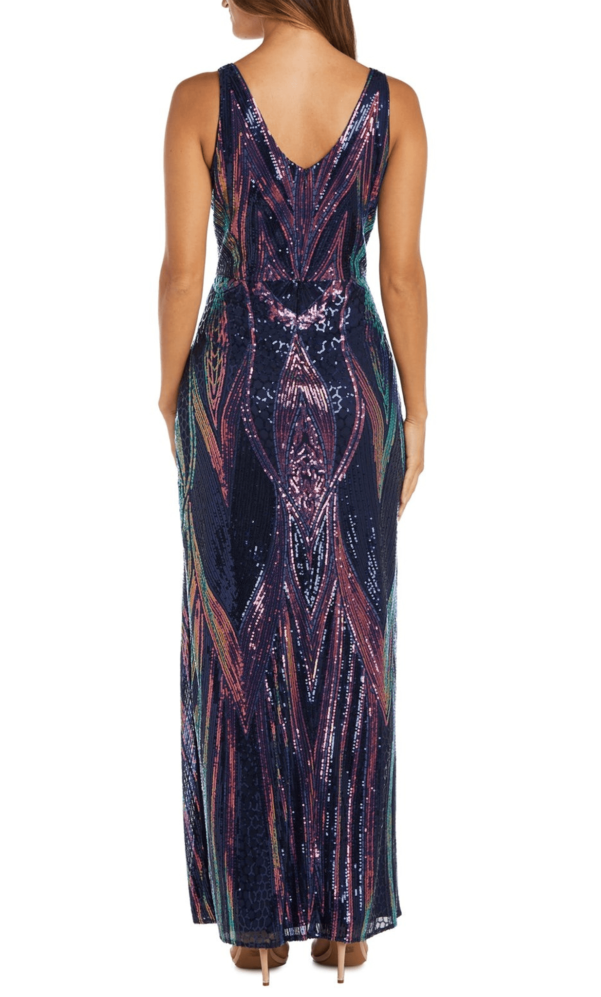 Introducing the Nightway 22089, a stunning gown that exudes a sophisticated and futuristic charm. This piece is crafted from high-quality sequin tulle fabric and showcases contemporary patterns that are sure to turn heads. The sleeveless bodice is elegantly designed with a flattering V-neckline and scoop back, which is seamlessly complemented by a discreet hidden back zipper for added comfort and convenience. The form-fitting skirt gracefully cascades down to the floor, boasting a sleek and slenderizing sheath silhouette. The side slit adds a touch of allure and offers a glimpse of skin. This Nightway 22089 is the perfect match for the girl who wants to look both sexy and fashion-forward. Model is wearing Navy color.