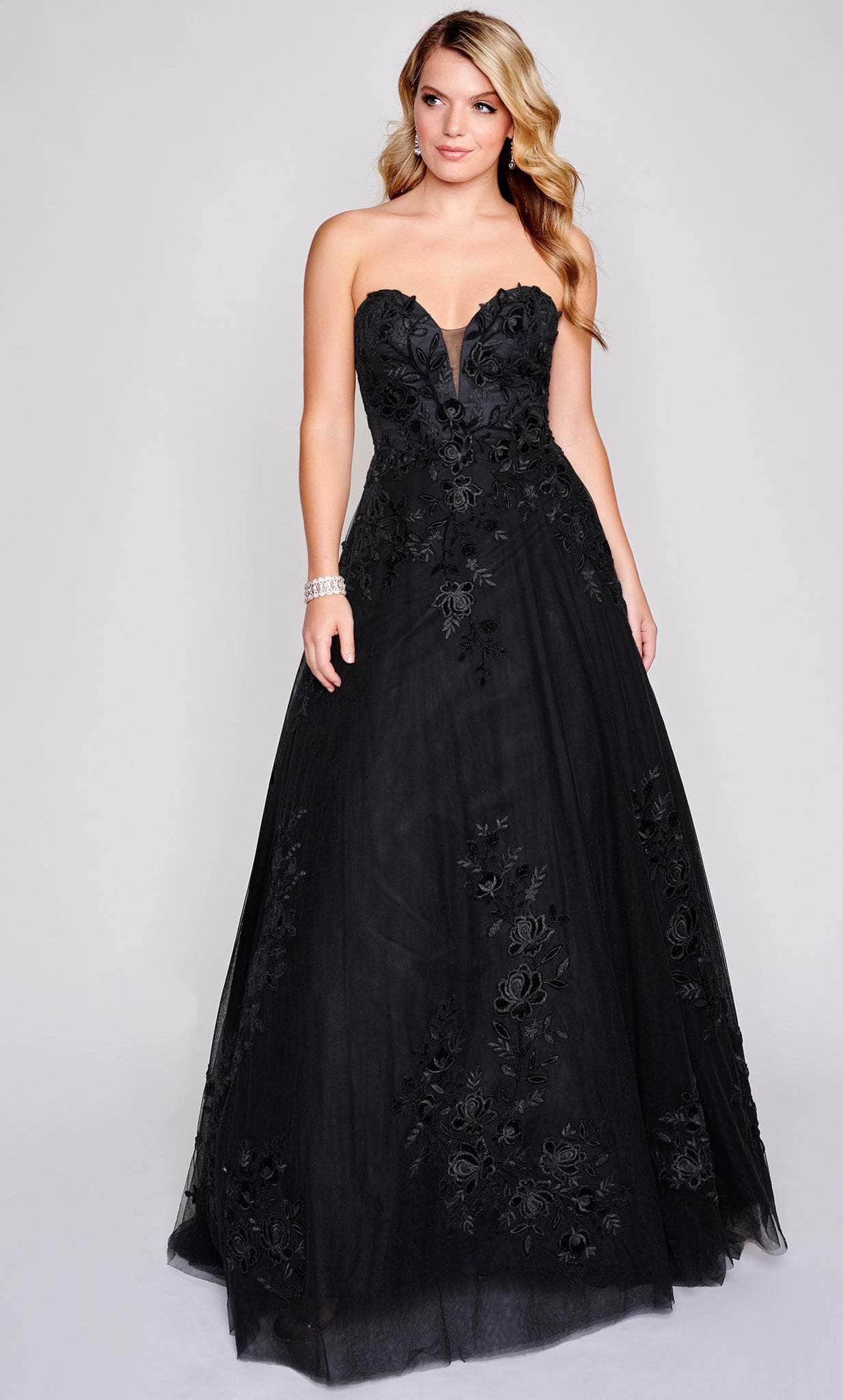 Wear the Nina Canacci 2361 creation as you brave the evening with temptress beauty and grace. Stunningly embellished with floral 3d embroideries all over this fabulous gown. Charms with a strapless bodice crowned with a sweetheart neckline accented with a sheer inset. A center zipper closure secured the mid-open back while the full-length skirt parades in an A-line silhouette with a sweep train finish. In a posed evening gown from Nina Canacci 2361 masterpiece, you look sophisticated. Models are wearing Black, Green and Ivory colors.