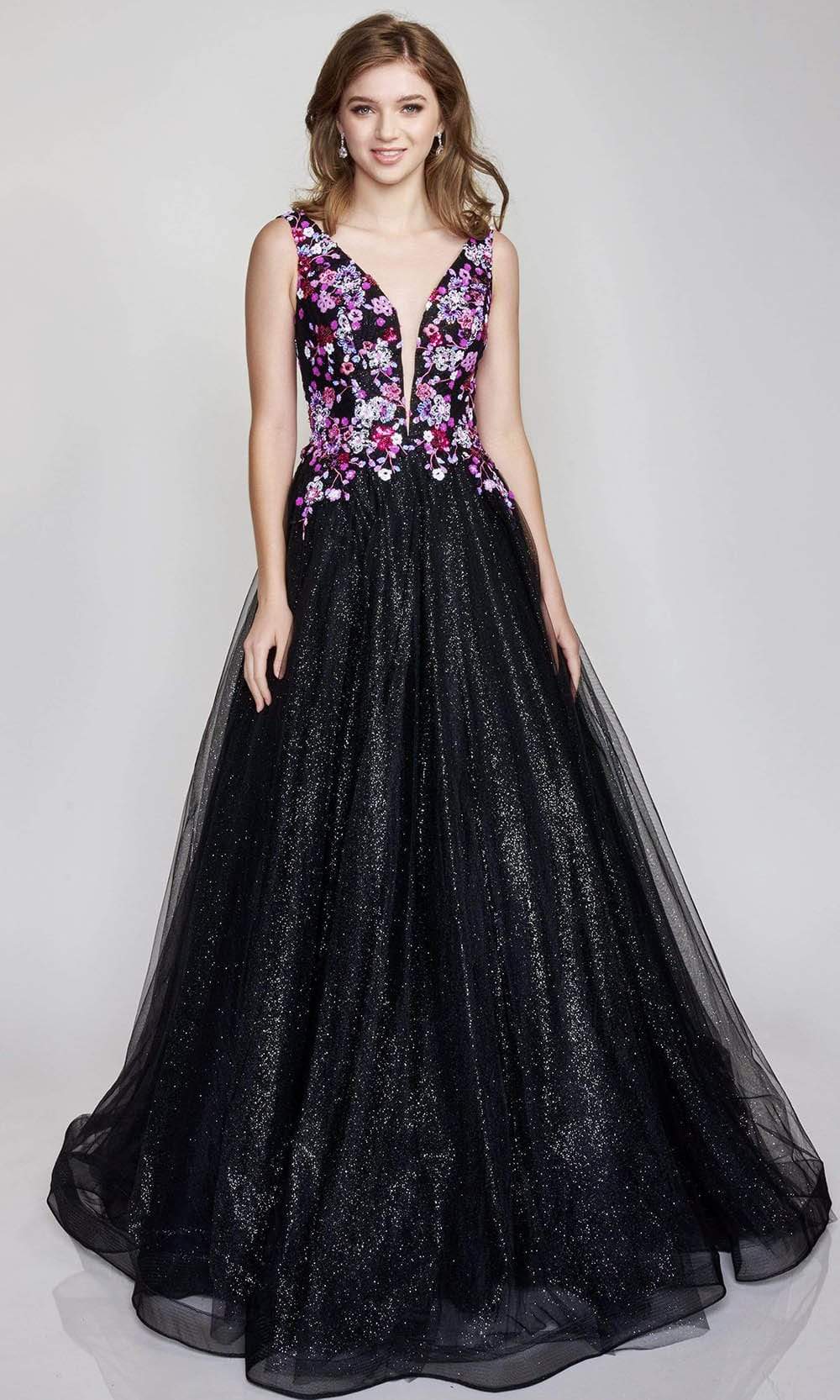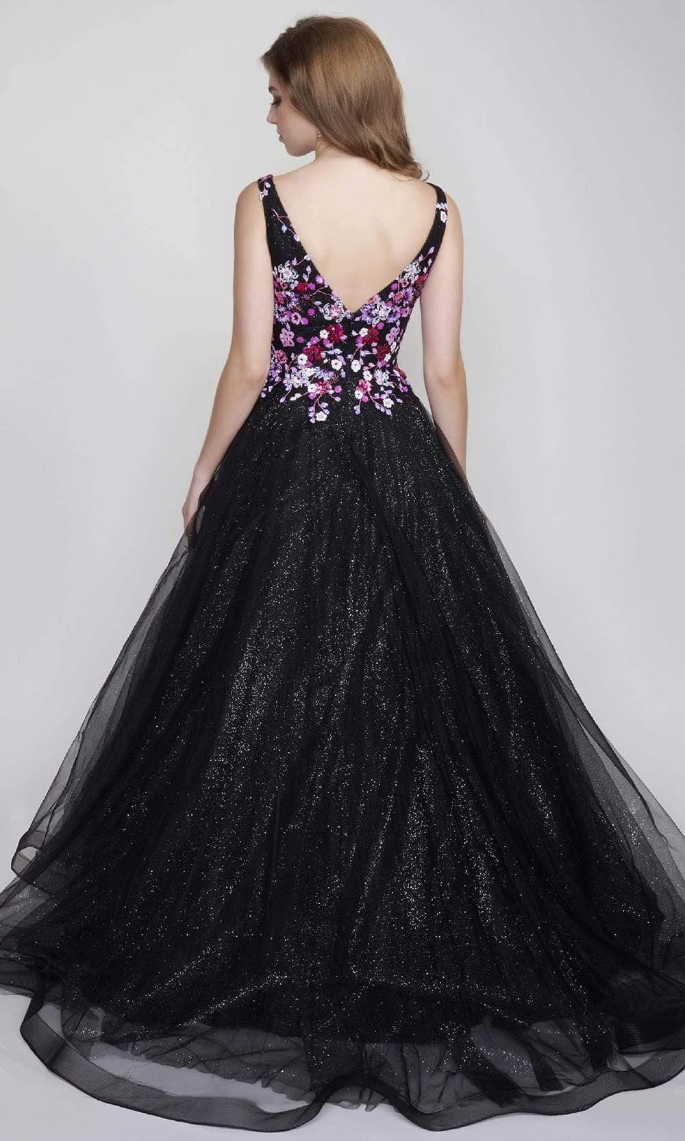 | Details: | Sleeveless, Plunging neckline, Floral, Sequins, Multicolor, Glitters, V Neck, Back zipper, Organza, Voluminous, Court train |