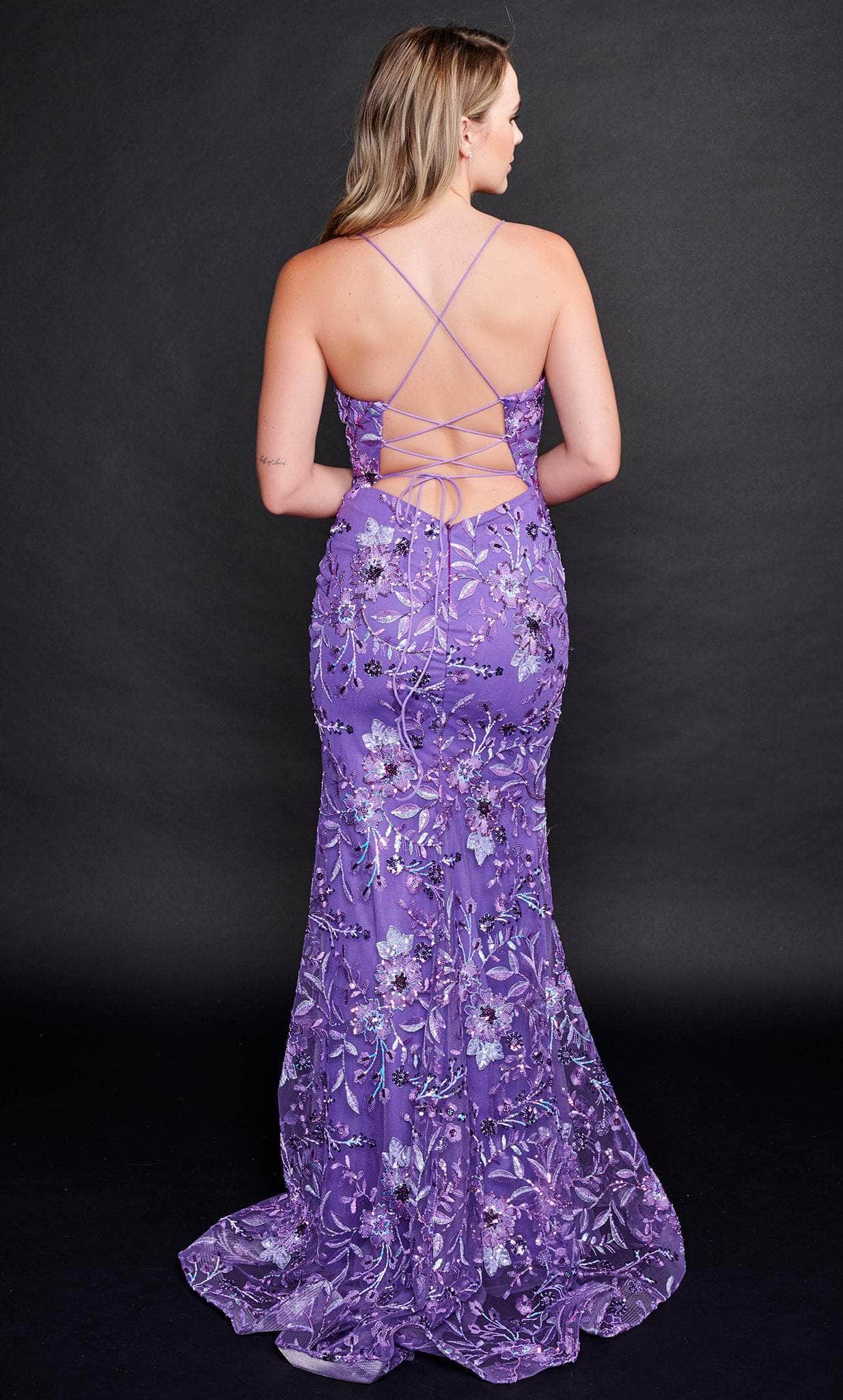 Capture that striking presence and get everyones attention in Nina Canacci 8212. Held together using that wire-thin straps that complements the low-placing of a seductive neckline on a fitted bodice. Designed with beads and sequins in floral pattern throughout the dress and it parades a beautifully fitting sheath silhouette that runs to a floor-reaching hem. Back is open and uses crisscross lace-up tie to secure. This Nina Canacci 8212 creation is simply breathtaking! Model is wearing Purple color.