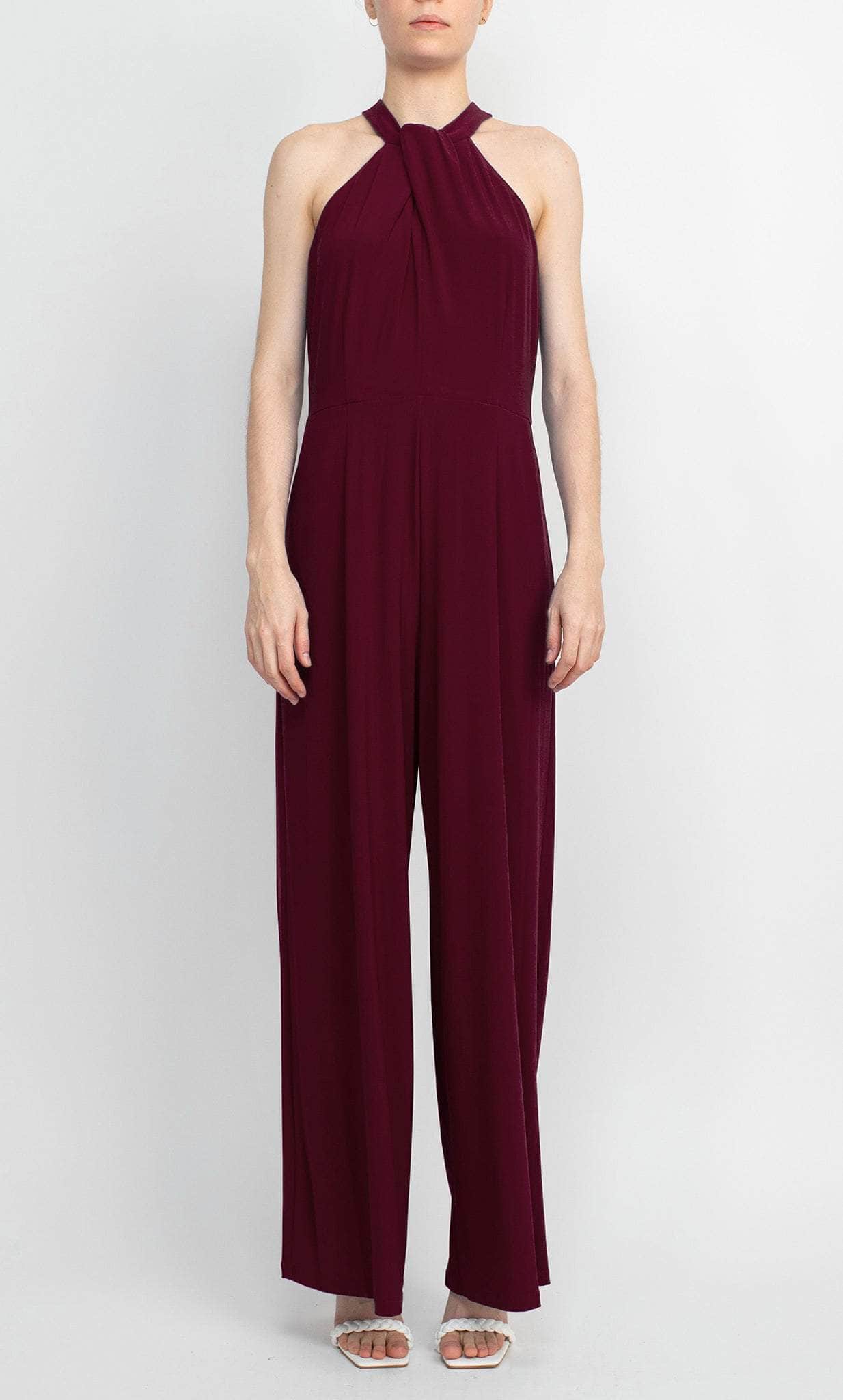 Revel in the streamlined beauty and ultra chic style of this Nina Leonard L9703B creation. Tailored to perfection with contouring lines along the rich jersey silhouette, this stunner features a halter neckline that parades a knot strap accent. Flatteringly accented with a cutout on a striking racer styled back with a zipper closure, this jumpsuit ensemble parades a straight pair of pants. Adorn yourself in an ultra chic style in this stylish Nina Leonard masterpiece. Models are wearing the Ivory, Deep Wine, Nina Red, Deep Sapphire, Dark Olive, Classic Blue, Emerald, Black, Mustard, and Blush colors.