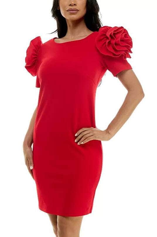 Take center stage with this classic style from Nina Leonard L9811AF. The dress is designed to hug your curves, while the short sleeves with a flowery ruffle accent add a touch of feminine charm. It is crafted from a scuba crepe fabric that creates a comfortable and chic appearance. Also, the scoop neckline and natural waist are striking features. The sheath skirt drapes down to the short hemline perfect for showing off your sexy legs. This Nina Leonard L9811AF dress is simply perfect for your next event. Models are wearing Amethyst, and Red colors.