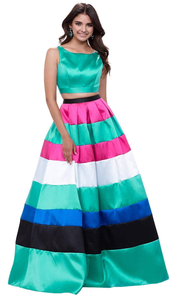 Reclaim your right to be the belle of the ball in this vivid two-piece ensemble. This A-Line stunner features a harmonious combination of a modest bateau neckline and a sassy scoop open back. Contoured to perfection, a pair of princess seams graces its sleek cropped bodice and features an alluring display of the midriff. The waist is gathered by a simple ribbon band that guides the stunning cascade of its color blocked Mikado fabric to a full-length hem. Dance with flourish and confidence all night long in this stunning wonder.