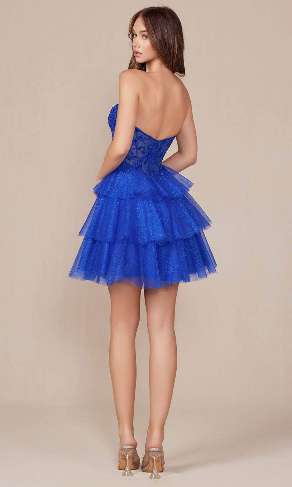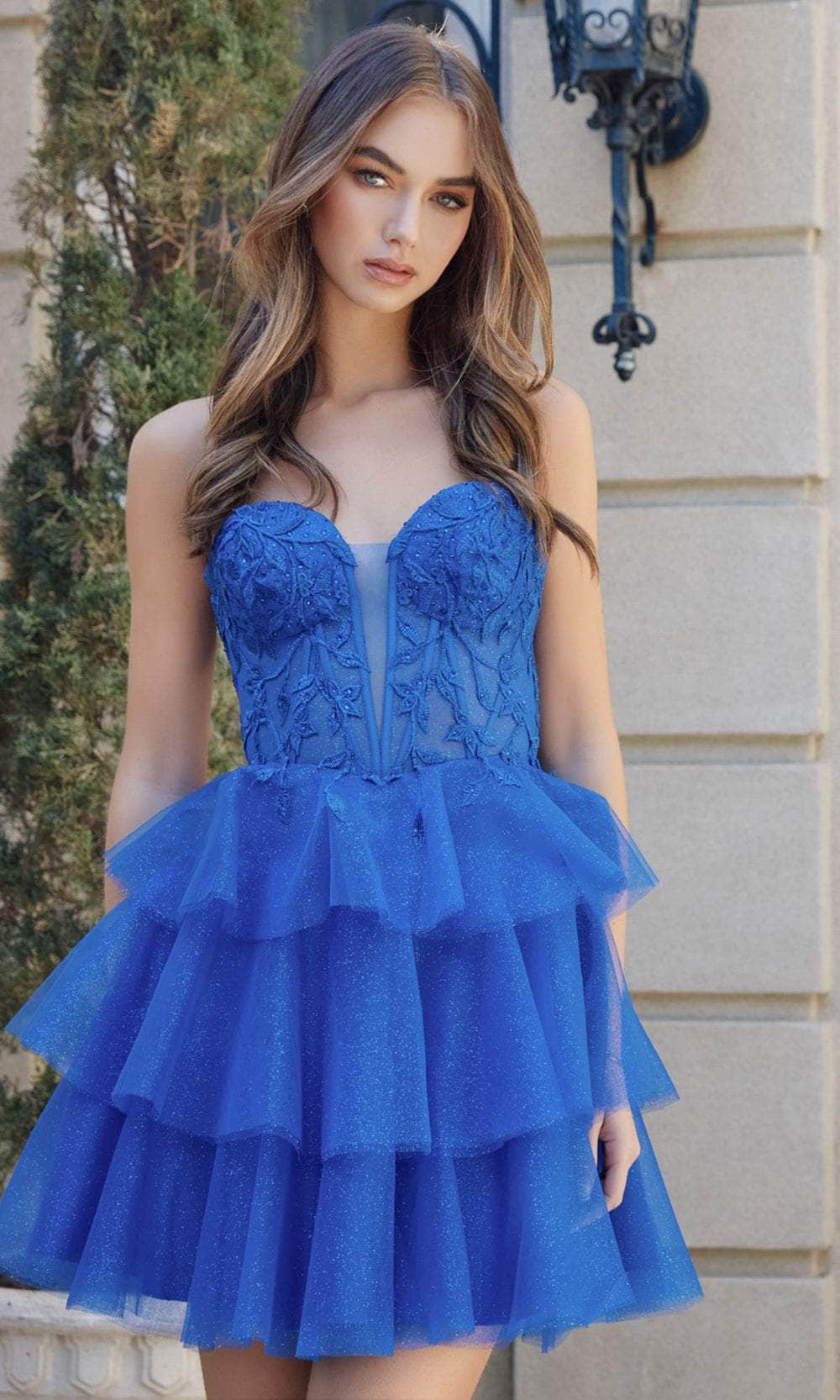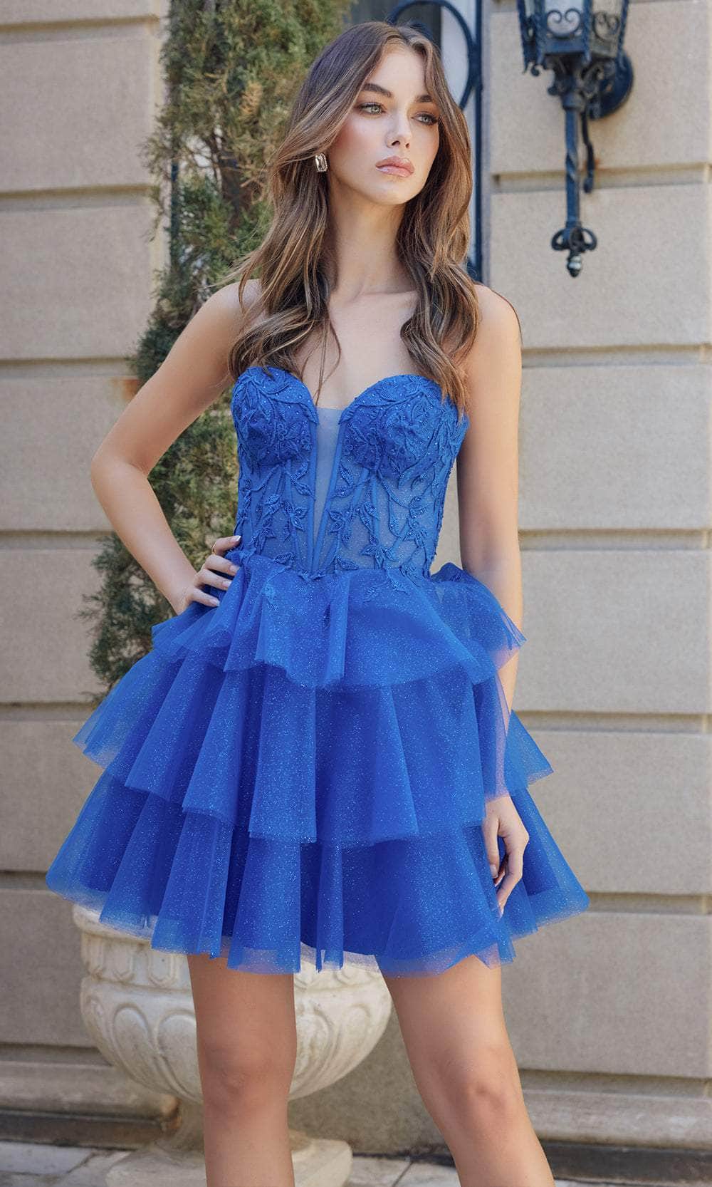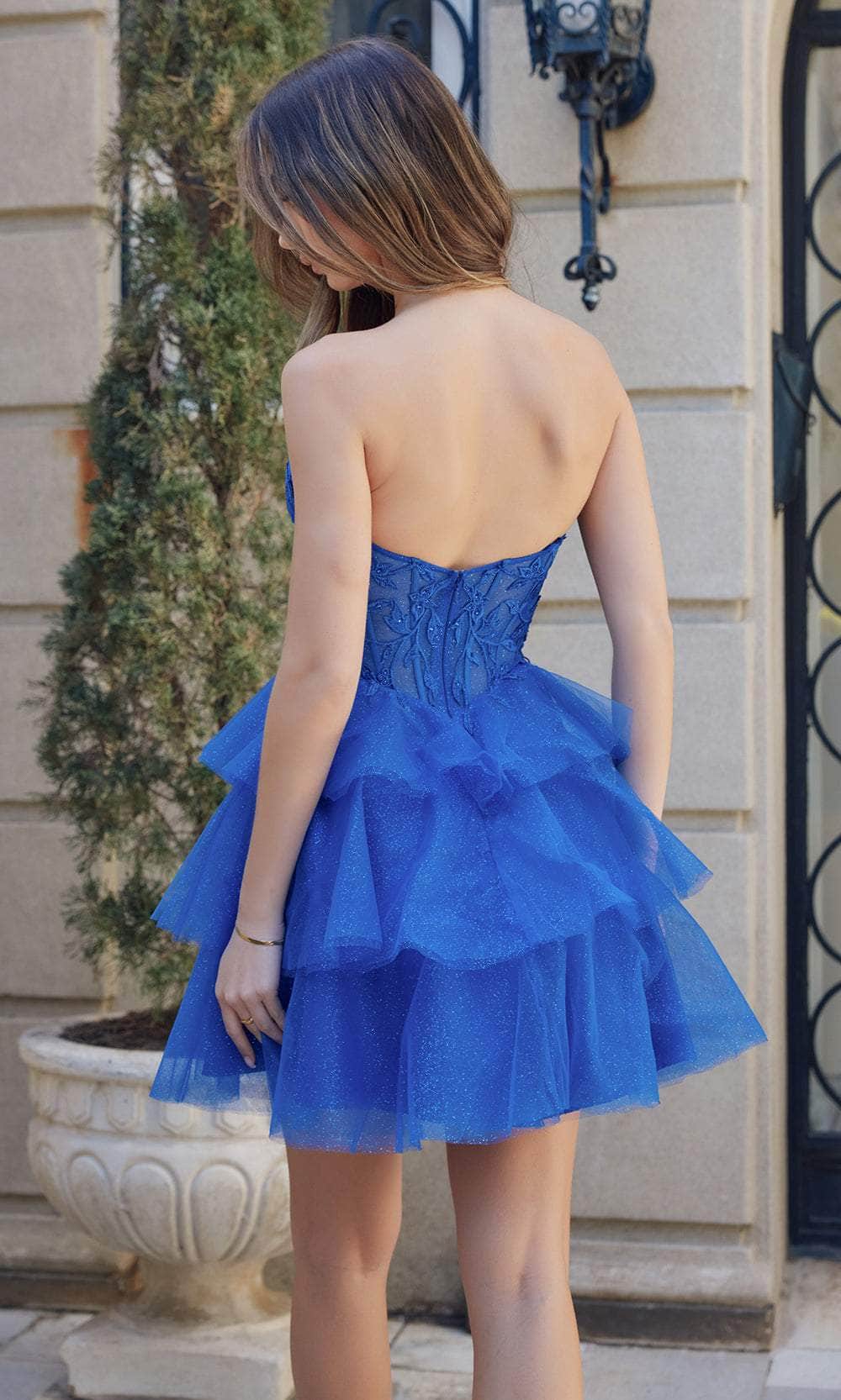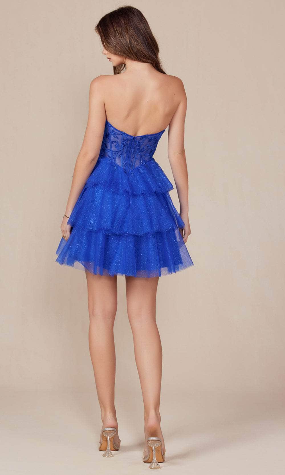 Capture that striking presence with this Nox Anabel A824 is a stunning short-length dress adorned with delicate embroideries. It features a strapless sheer corset bodice with a plunging V-neckline, offering a touch of allure. A center back zipper ensures a perfect fit, while the tiered A-line skirt adds a playful yet elegant flair. Ideal for any special occasion, this Nox Anabel A824 beautifully combines sophistication and charm, ensuring you make a memorable impression. Model is wearing Royal Blue color.