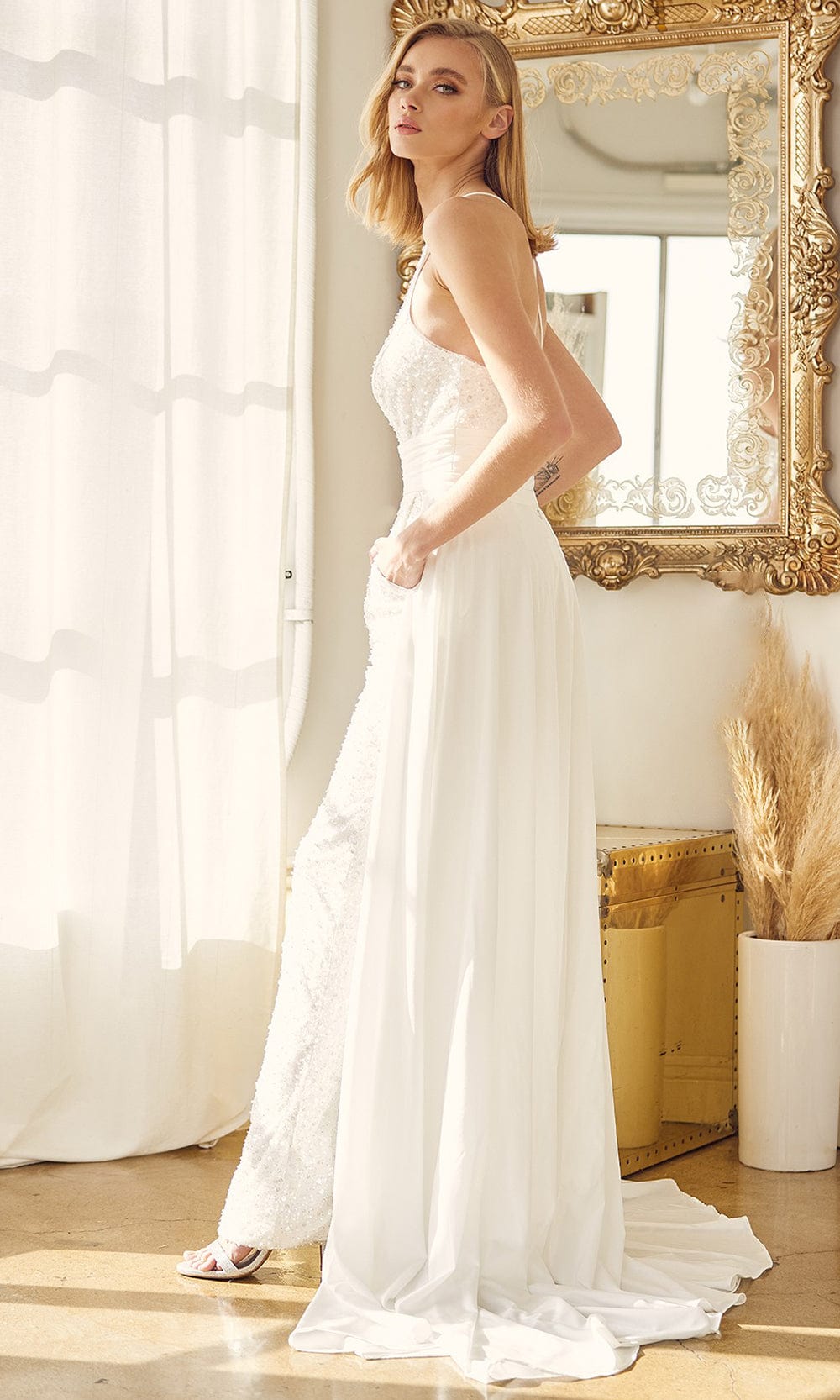 Surround yourself with sparkle of glamour when you walk in this  dazzling Nox Anabel Bridal JE926 creation. This floor-length jumpsuit is richly embellished with sparkling sequins throughout. It features a plunging V-neckline and wide waistband with a sheer inset at the bust while the open back highlights a crisscross strap and zipper closure. A gorgeous detachable overskirt completes this exceptional beauty. This Nox Anabel Bridal design is sure to create a striking look that is sure to make anyone remember your grand entrance. This stunning collection of Nox Anabel dresses will reflect your personality and give you an elegant red-carpet look. Model is wearing White color. Find more Formal Pantsuits.