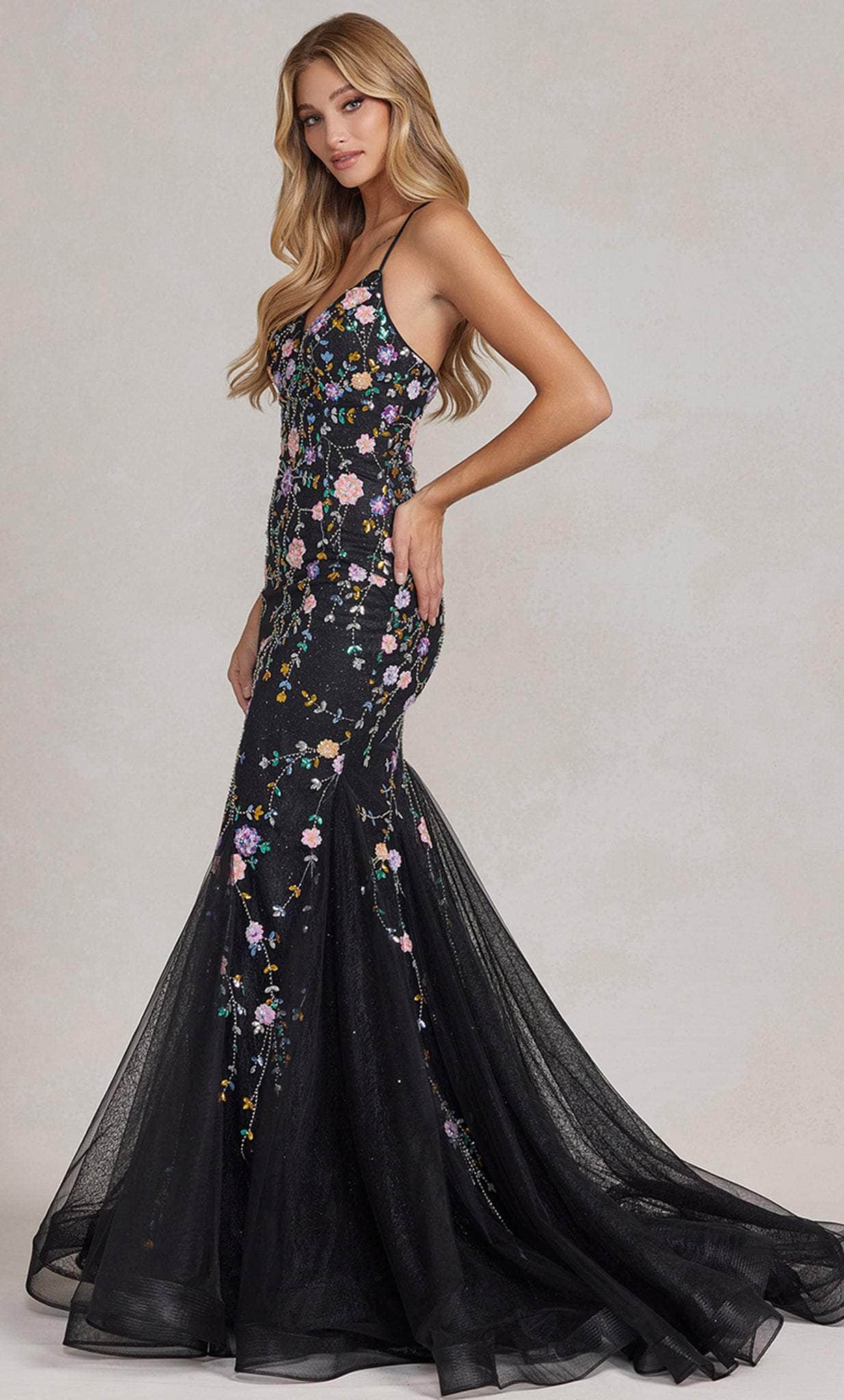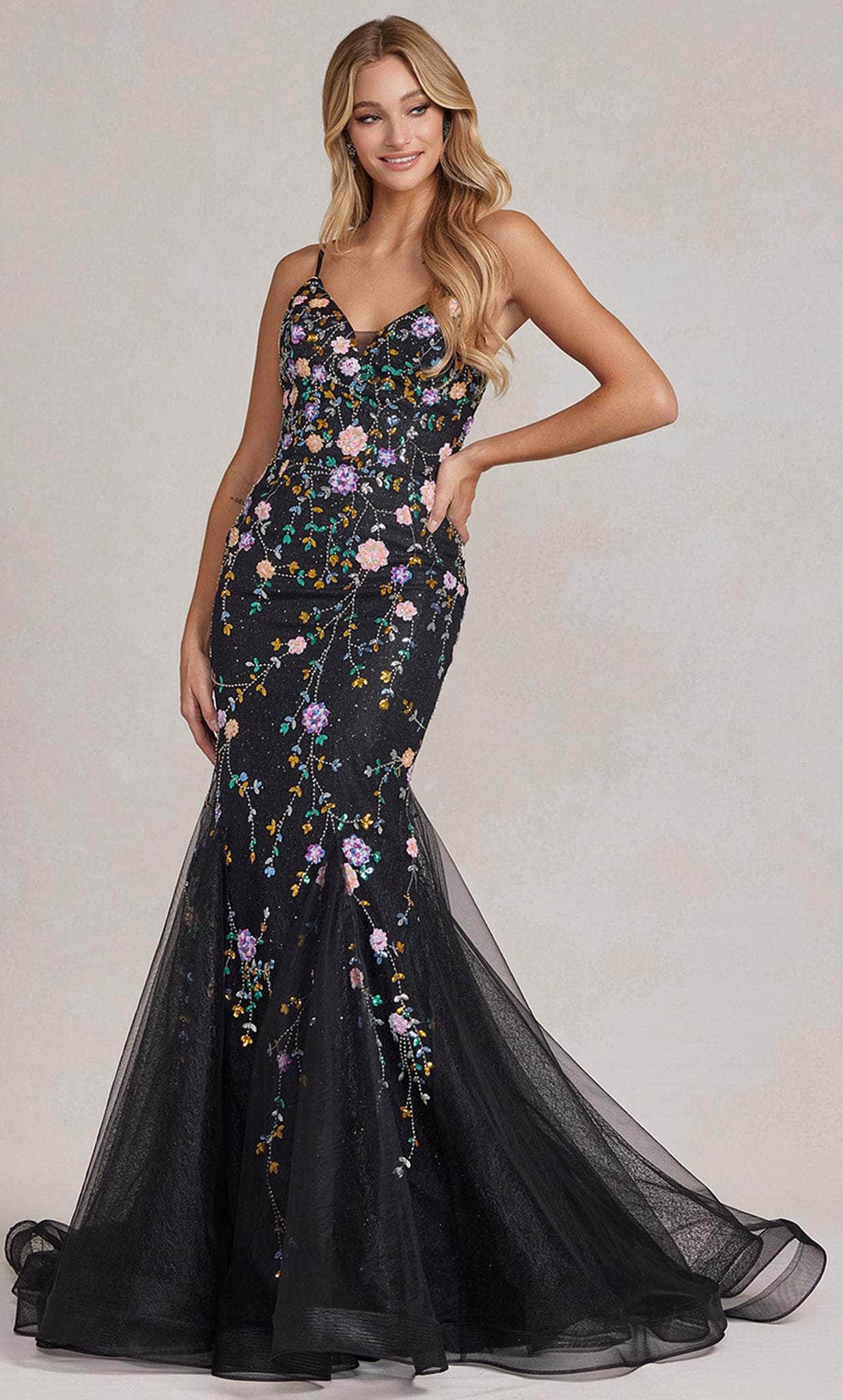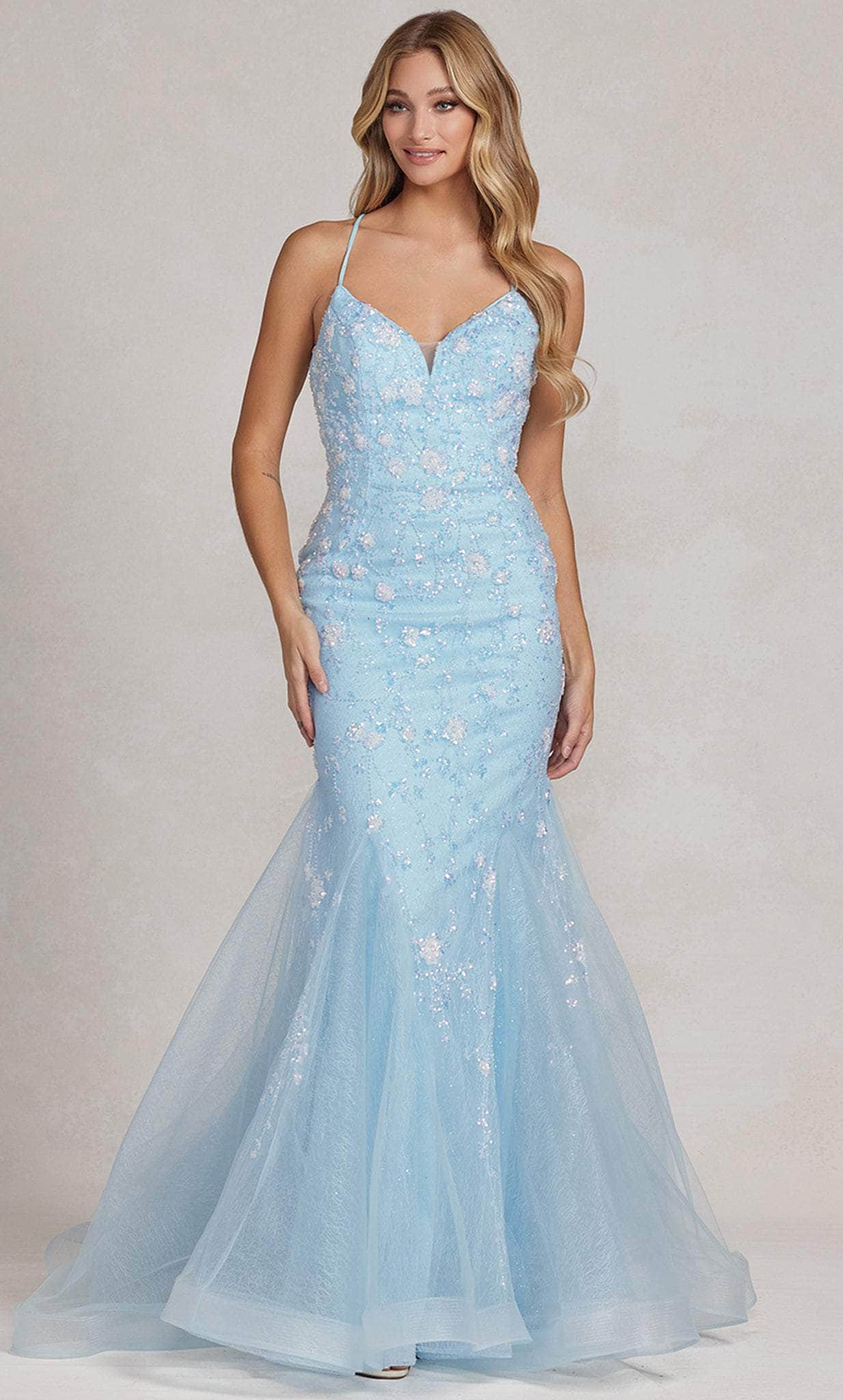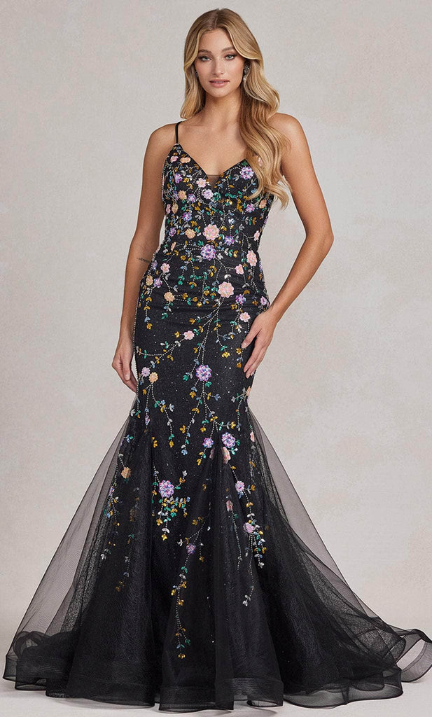 Enter the hall with grace and beauty in Nox Anabel C1117 masterpiece. The sleeveless gown is decorated with sequin floral appliques and beadwork throughout the silhouette. It features a deep v-neckline, spaghetti straps, and an open lace-up back. The skirt has a captivating godets accent to create a trumpet silhouette and finishes with a spill of sweep train. Feel dainty and feminine in this enchantingly designed Nox Anabel C1117 gown. Models are wearing the Black Multi, White Multi, Lilac, and Sky Blue colors.